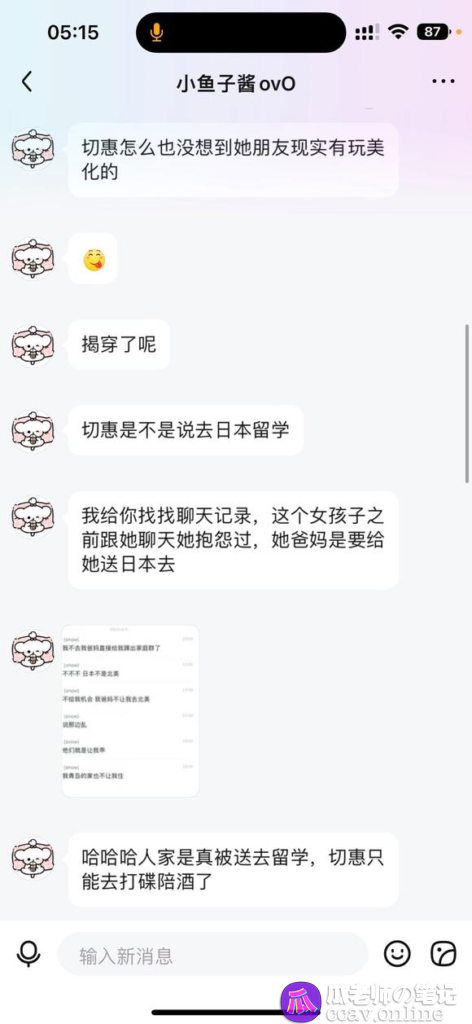 sonw就是原主小姐姐是真白富美,和切惠是现实朋友,切惠一直发的她的生活截图…甚至连留学去日本都是模仿她,这是有多羡慕人家啊,自欺欺人成这样