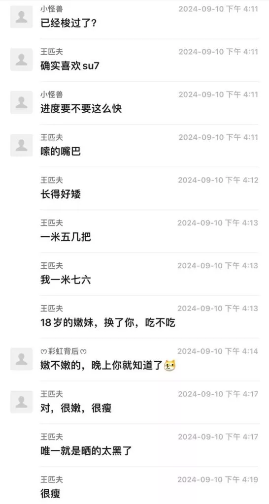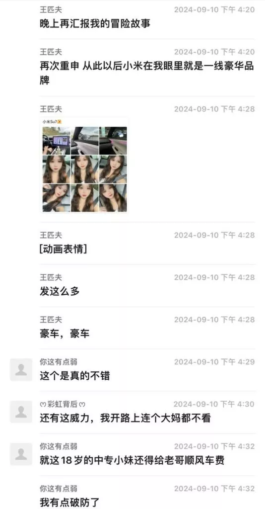 甚至开始怀疑这是否是一种新型广告。在一个网约车主的群聊中,一位司机透露,有一位美女为了能够乘坐他的SU7,宁愿绕路,而且为了拍照发圈,甚至不惜献身于车内激烈的亲密接触。