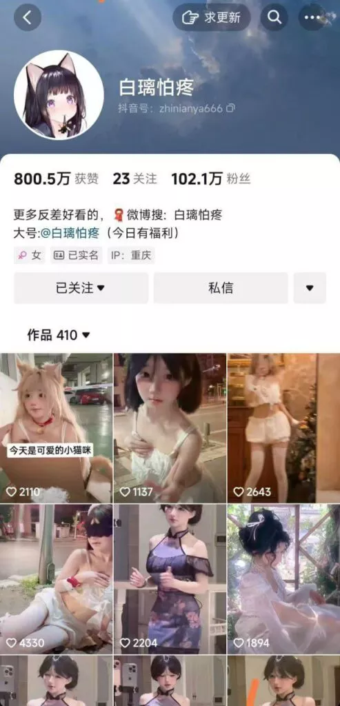 抖音102万粉丝网红coser白璃怕疼,清纯又带着邻家小妹一般可爱的样貌,但身材却无比火辣,LL长相配了一副御姐身材,收获百万粉丝,但近期却被曝在外网做福利姬,更是有超大尺度视频流出。