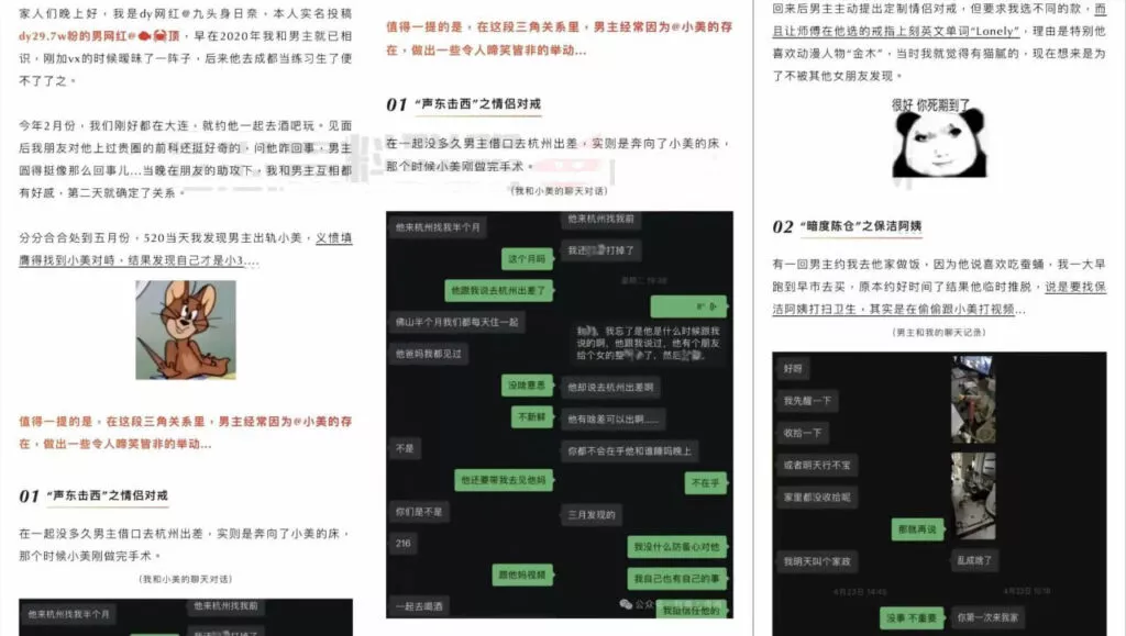 抖音女网红九头身日奈9m近日实名举报男网红于谢顶,指控其背弃爱情,与多名女性保持暧昧关系。她揭露于谢顶欺骗感情,还在与女生视频聊天时轻佻。震惊的是,他在开房时使用女方身份证,并为了掩盖劈腿行为谎称“去拉屎”,在机场短时间内声称“去了五次”。
