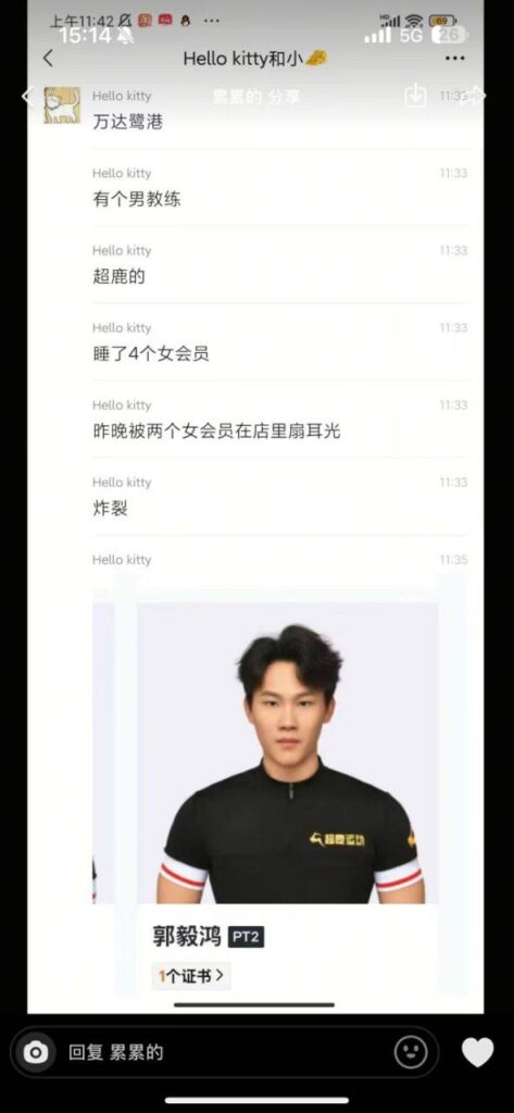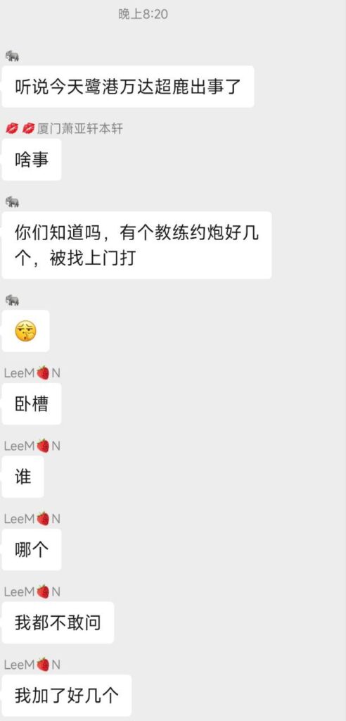 厦门鹿港万达超鹿健身房私教,同时与四名女学员保持暧昧关系,约的时候多风光翻车的时候就有多狼狈,东窗事发后,被四人围堵在健身房一顿耳光伺候。