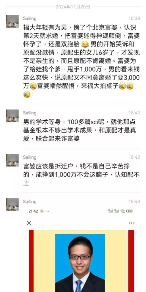 福州大学的刘西蒙教授因其不端行为而受到曝光。他在已婚的情况下,竟与一位来自北京的富有女性建立了关系。他们的交往仅持续了一天,刘教授便向富婆求婚,并以“身世可怜”的故事博取同情,成功诈骗了她1000万元。此外,刘西蒙还谎称自己的妻子出轨,声称孩子并非自己的,企图继续实施诈骗。然而,富婆最终觉察到事情的真相,发现这其实是夫妻联手作案。