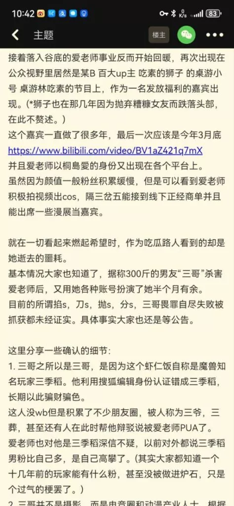网传著名coser桐岛爱被渣男杀害弃尸荒野,引起轩然大波。桐岛爱以精湛的cosplay技巧和角色还原度在二次元圈子享有盛誉,粉丝遍布全球。