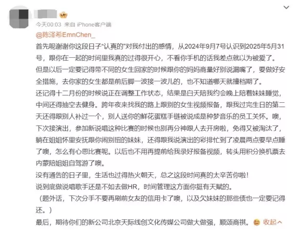 嘻哈圈近期引发了一场重磅新闻,知名Rapper陈泽希因前女友的爆料卷入了劈腿门事件,持续引发广泛关注。曾以“三观正”的形象获得众多粉丝喜爱的陈泽希,其实在感情生活中却有着令人震惊的过往。据当事人提供的视频证据显示,这位男性在与现任女友交往期间,疑似频繁出轨,并保持着多段亲密关系。