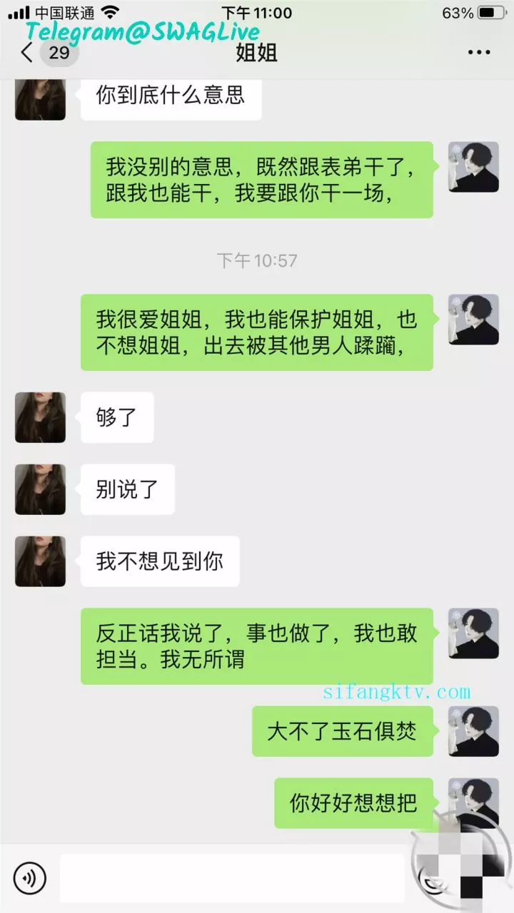 由于这俩天过节,事情有点多,更新的稍慢一点。大家见谅哈本来打算趁着过节跟我姐喝点顺便把我姐拿下,但是我姐天天早出晚归没有机会。所以我继续用小号撩姐姐,结果发现了我姐的惊天大秘密,出轨了亲戚家的孩子。我姐出轨我能理解,因为她老公天天喝酒不误正业。但是没想到出轨对象是表弟,我整个人惊呆了感觉又刺激又意外。虽然我当时很想问问是谁,但是我怕被发现。所以我忍住了,没关系早晚能揭晓答案。