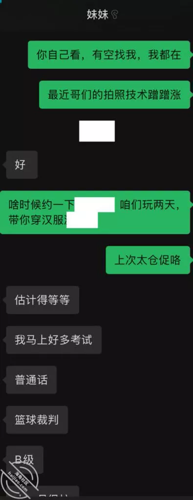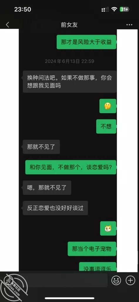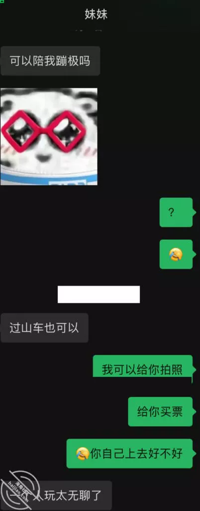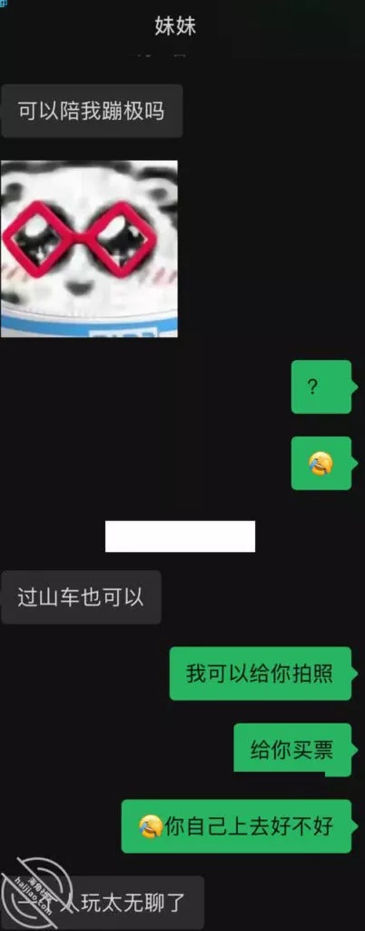 不得不说,如果女生反差起来,真的很可怕!之前和她出去玩的时候聊天,我就知道她有点M的倾向。和绿泡泡她聊天的时候,我经常发些训练的表情包,她竟然表示喜欢