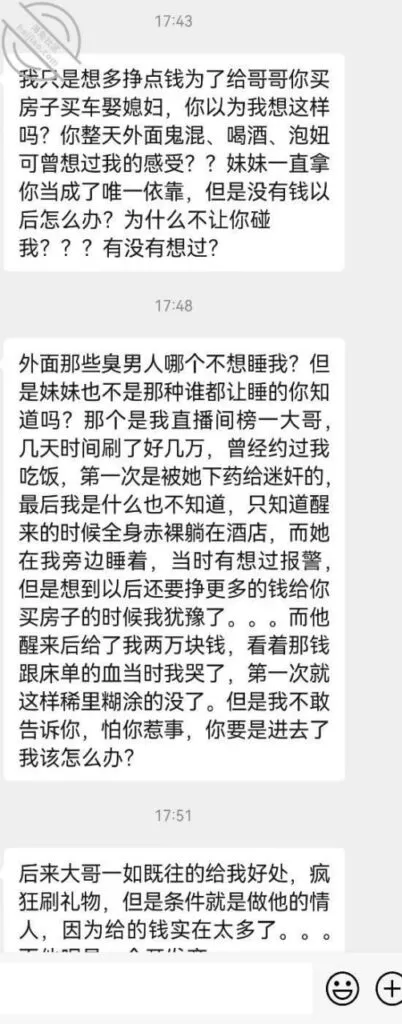 真的想不到妹妹竟是如此反差,反差到令我作呕, 我非常愤怒,但这次我并没选择摔门而出,而已冷静的坐了下来,看她如何狡辩,待妹妹洗澡出来的时候望了一眼我, 并看到我手上的手机, 妹妹此时已经意识到她的聊天内容被我看光了。 还没等我说话,妹妹开口道,“ 哥哥,这事情并不是你想象的那样子,我并没和他发生过什么, , ,他只是直播间之前给我刷了不少礼物, 本来他说要约我,但是我并没答应,我知道这样坐对不起哥哥。所以我拒绝了,,”