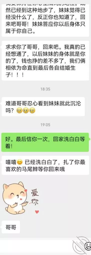 可昨天趁着妹妹洗澡的空档,快速翻看了她的手机,见有一个比较男性的头像点开,看到消息之后感觉天都要塌下来了,, 里面消息不多,只有最近几条, 应该是妹妹每次聊完都把消息删除了,就银秽不堪的信息,把我对妹妹美好的梦击碎了。
