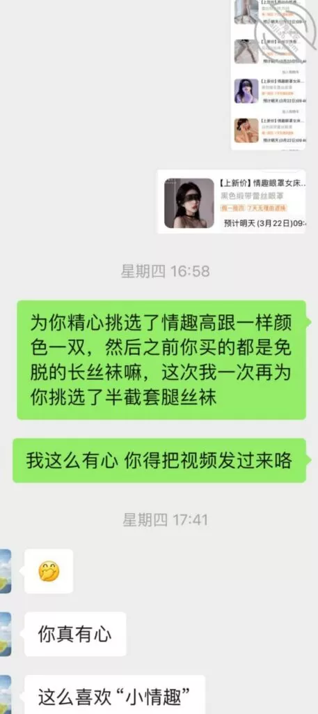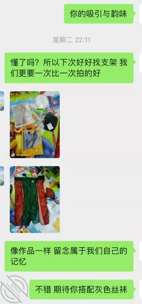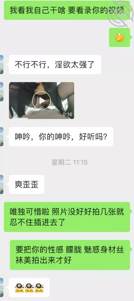 时间来到第三次前,又开始撩搔和我,我就提前撩到让她穿丝袜情趣等拍照,但是她还是没有答应,理解不了说年轻人的癖好,我直接就把我喜欢类型的情趣链接发给她让她去看选择,而后果然也是当她聊完就买了不同款式三套,并且我侧面和她聊拍照录像,因为她总是想纪念我一次顺水推舟和她说第三次要进行拍照录视频让她放开。