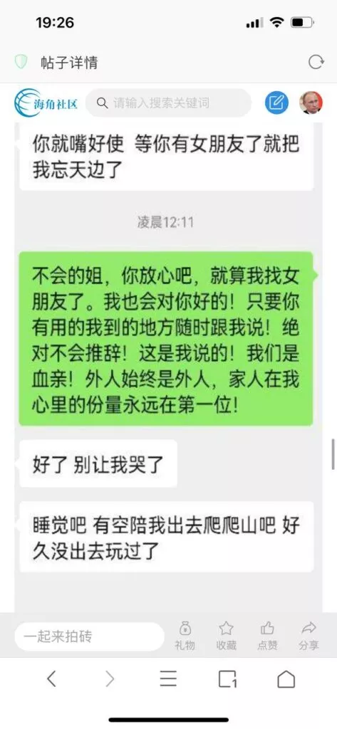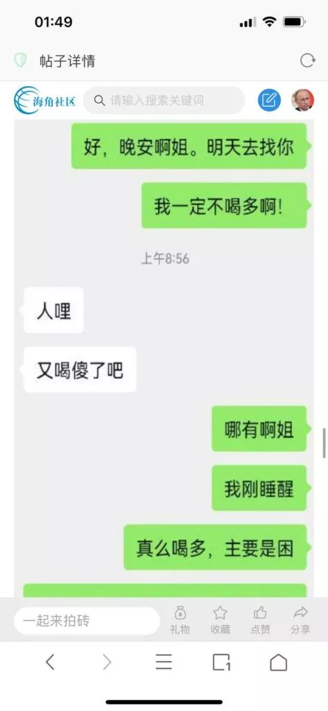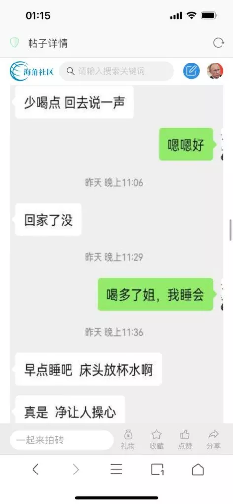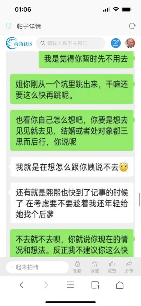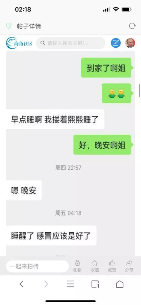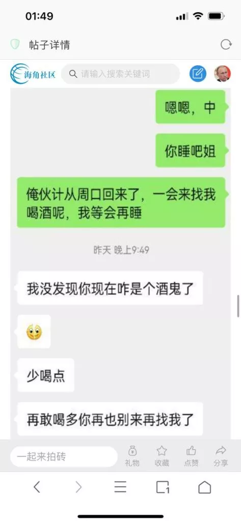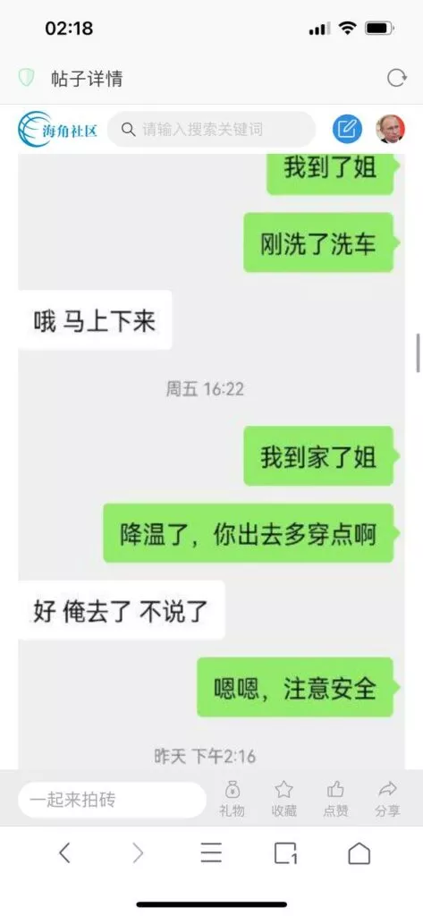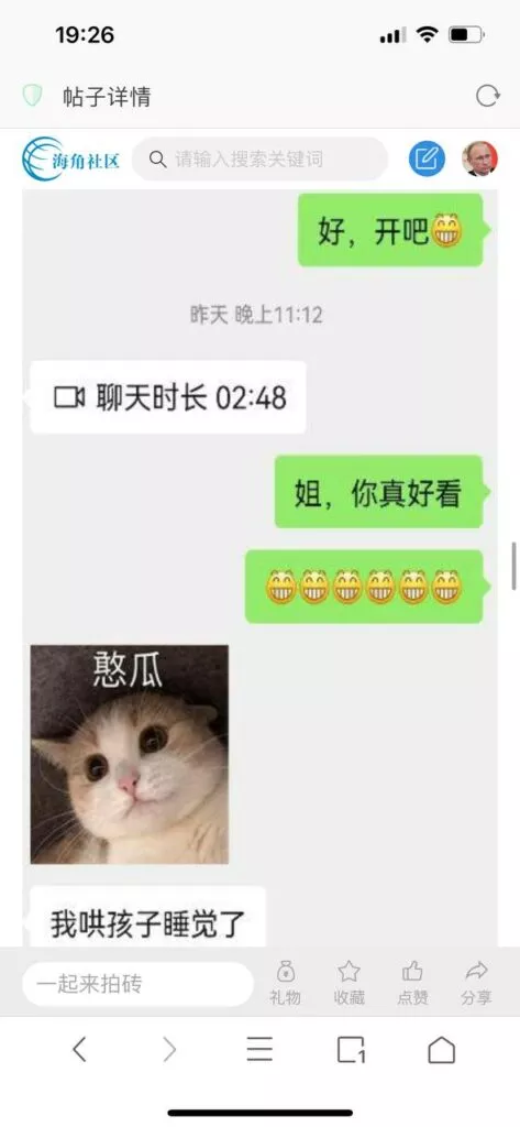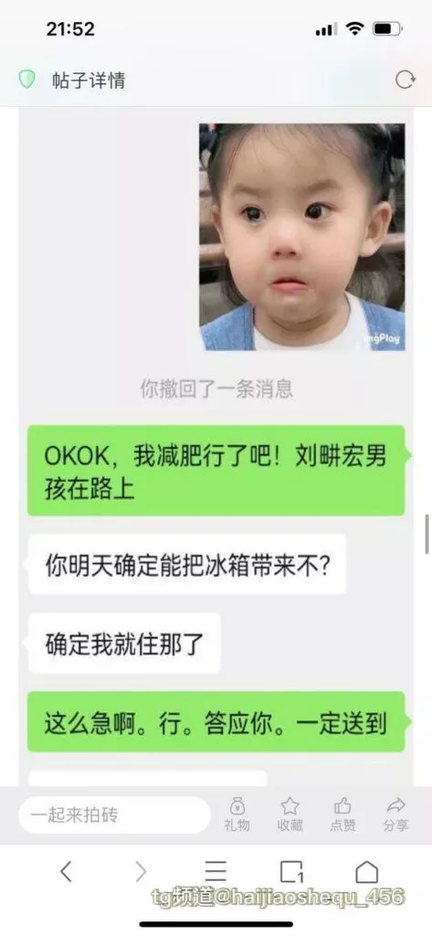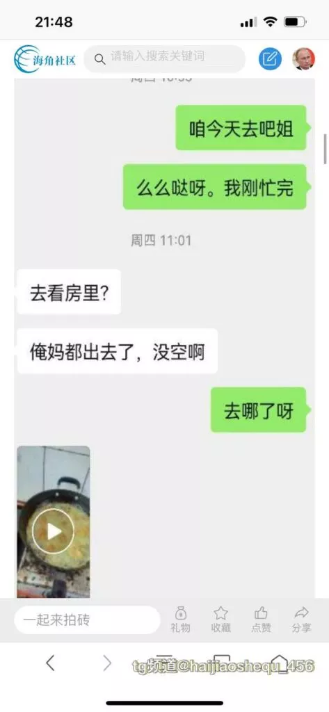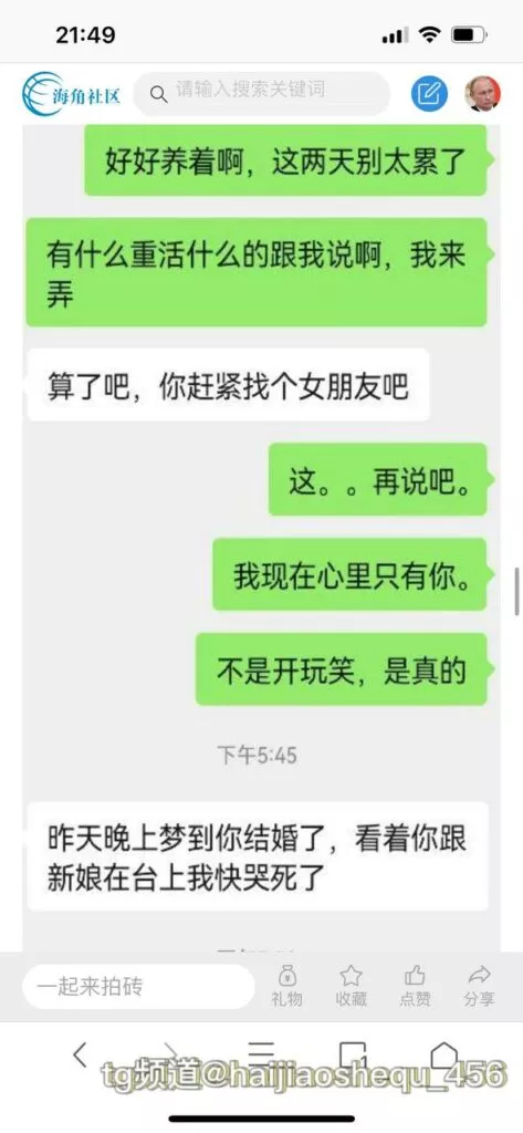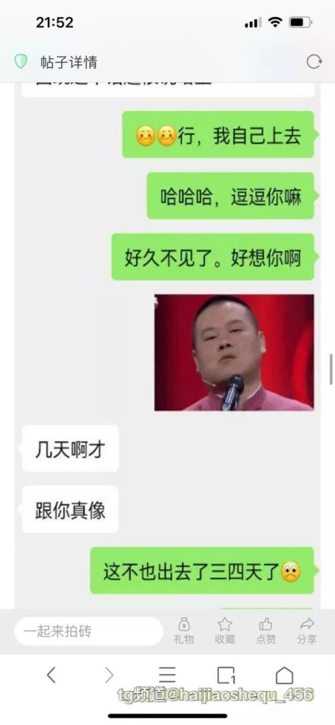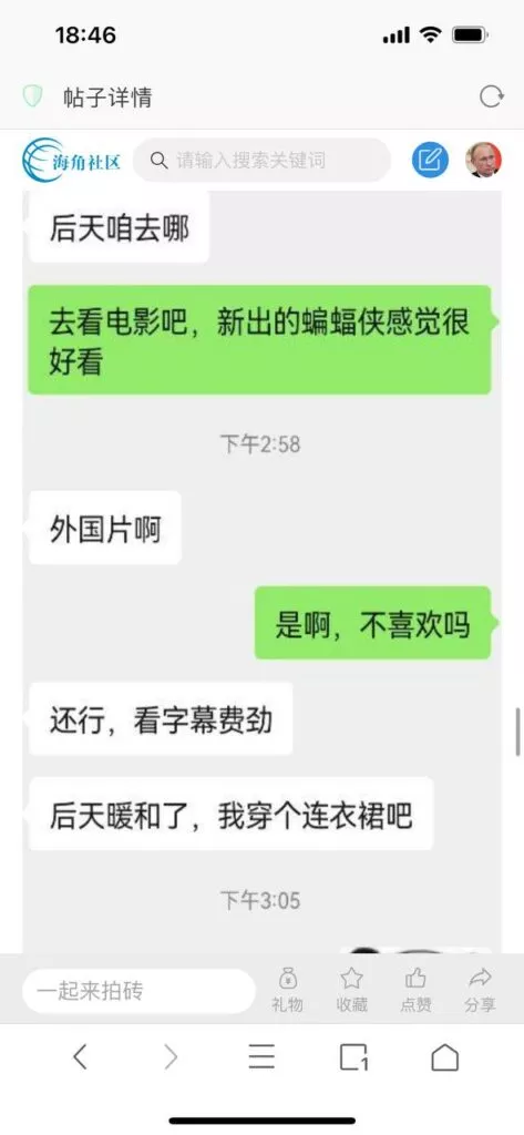 今天看电影也在犹豫要不要发一个视频。但也是我的锅,前几天晚上喝多了跟一个加我微信的海友打了微信电话,haijiaoshequ_456天南海北聊了快一个小时,脑子一热就答应了有机会再发一个帖。