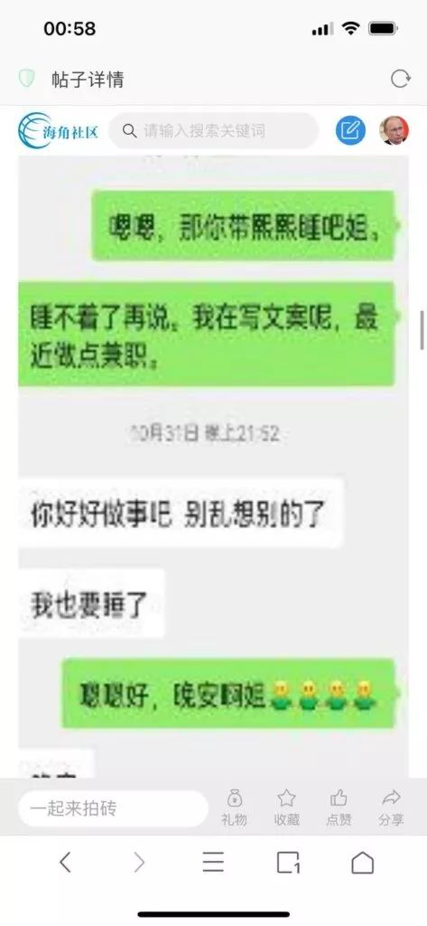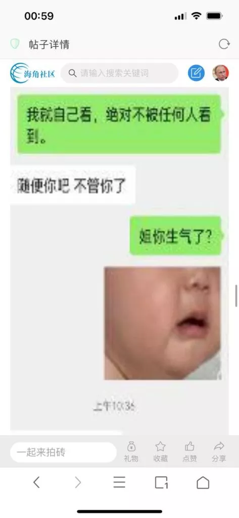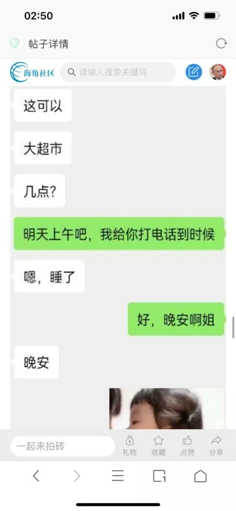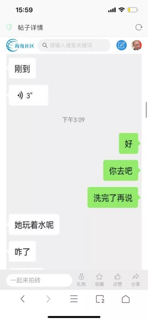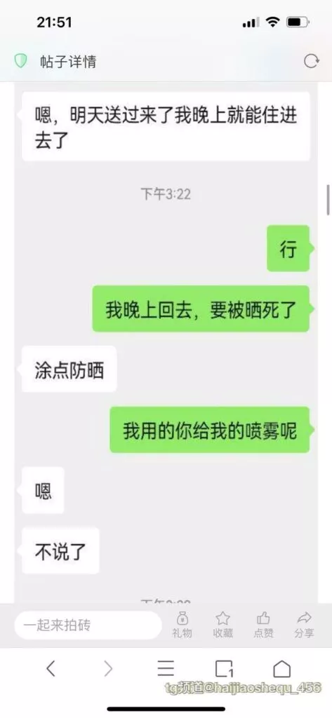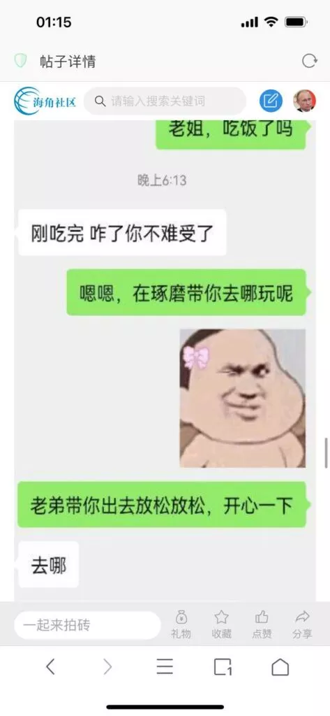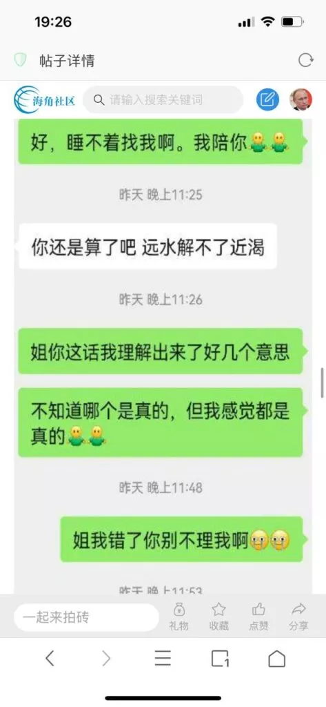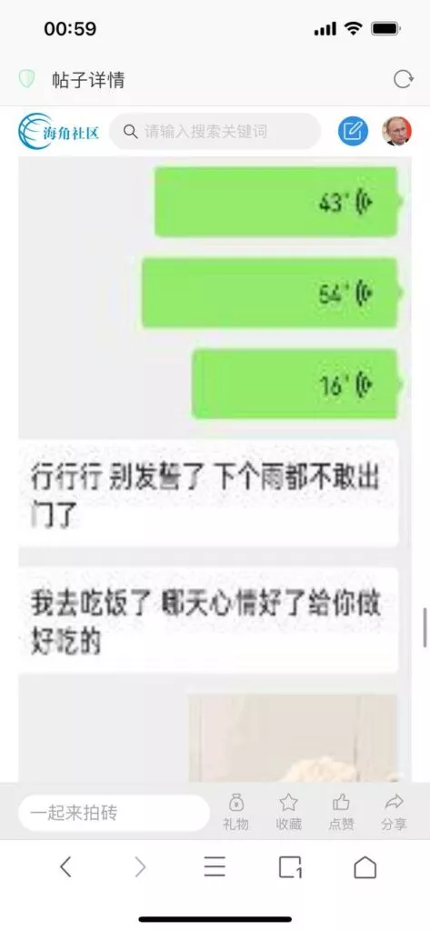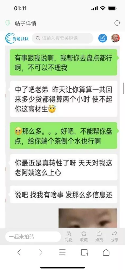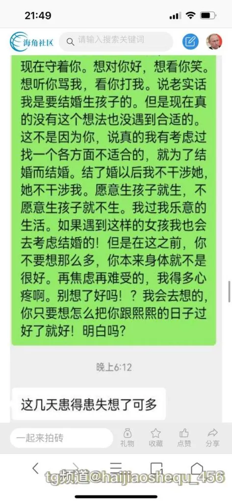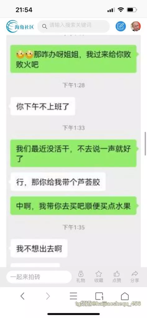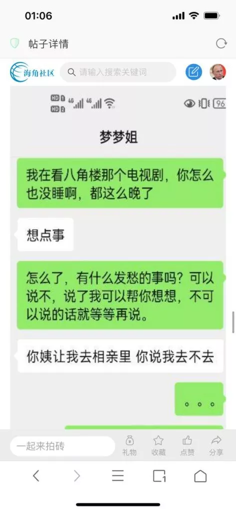 今天看电影也在犹豫要不要发一个视频。但也是我的锅,前几天晚上喝多了跟一个加我微信的海友打了微信电话,haijiaoshequ_456天南海北聊了快一个小时,脑子一热就答应了有机会再发一个帖。