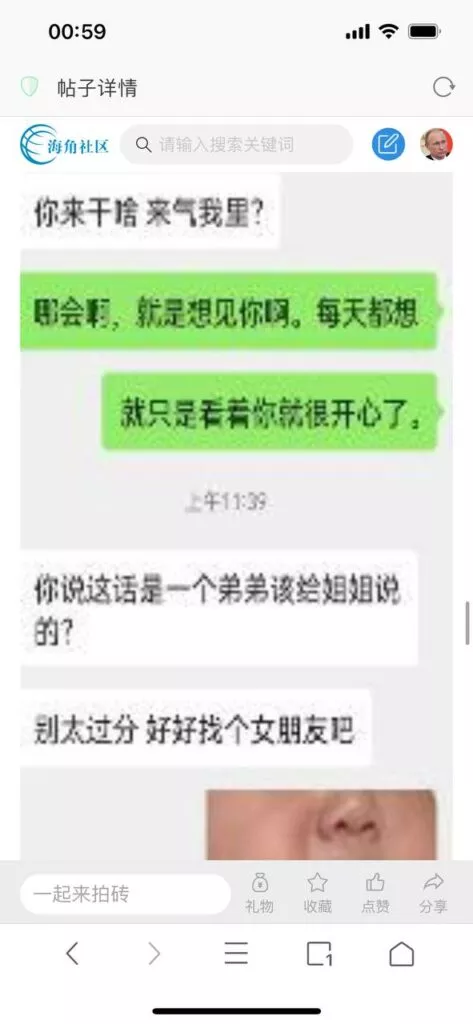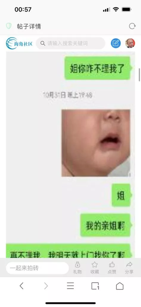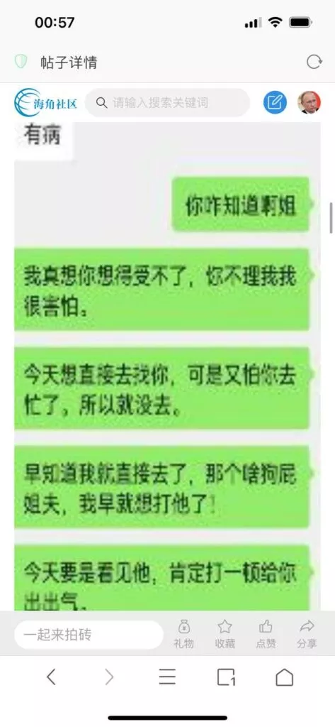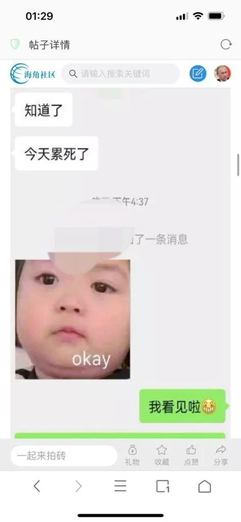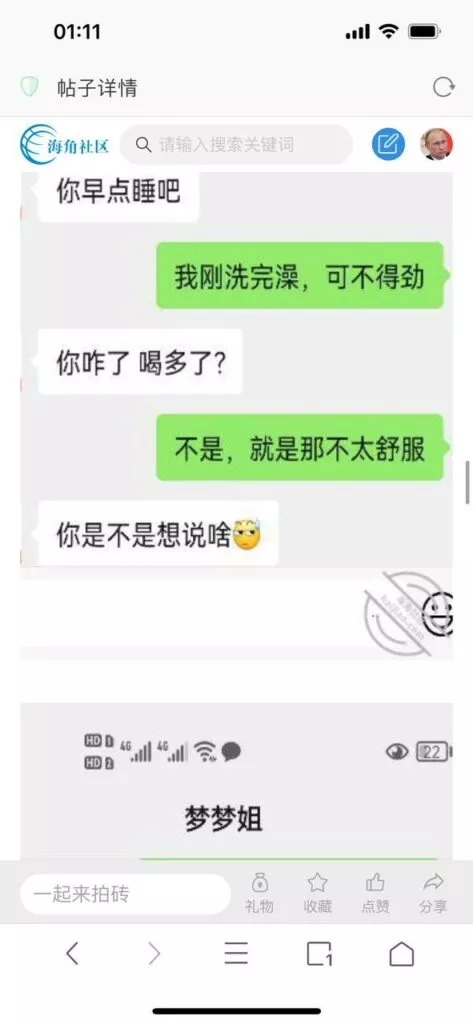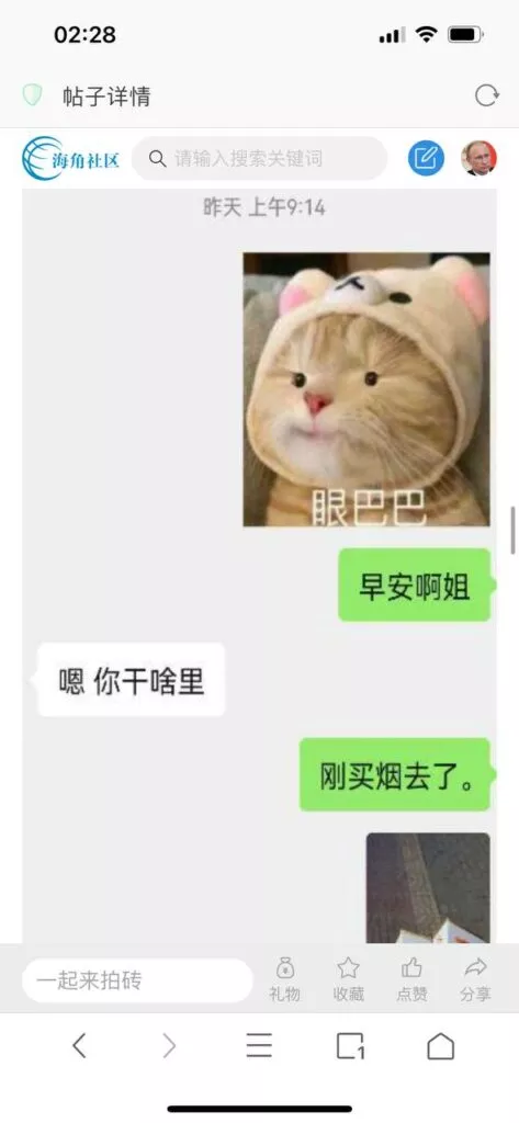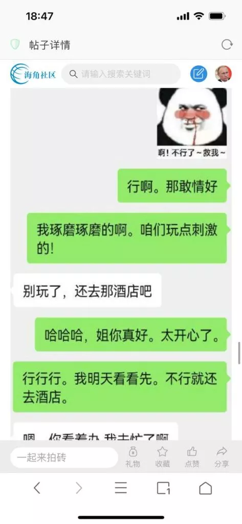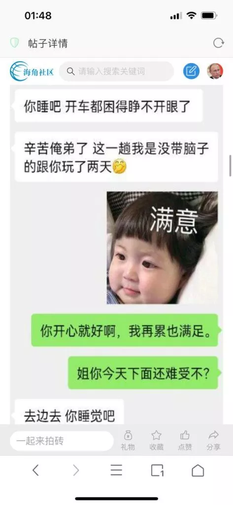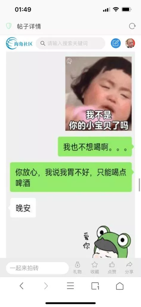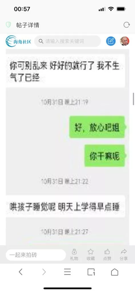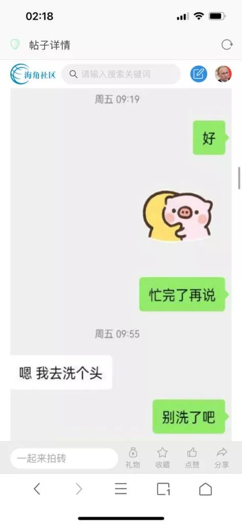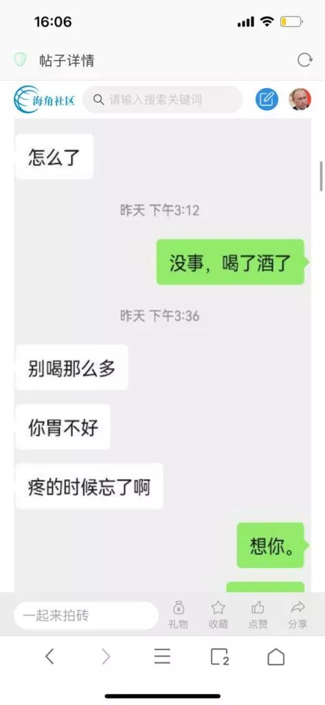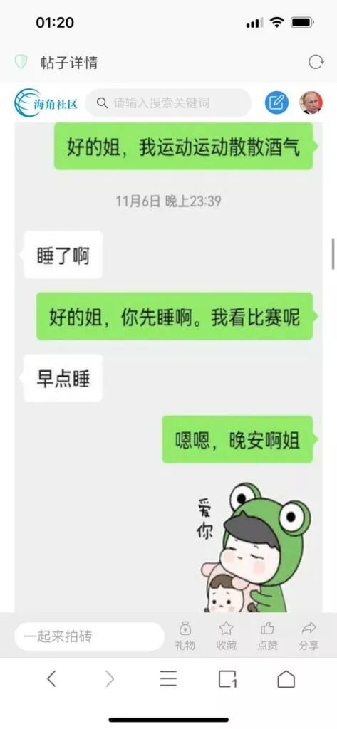 今天看电影也在犹豫要不要发一个视频。但也是我的锅,前几天晚上喝多了跟一个加我微信的海友打了微信电话,haijiaoshequ_456天南海北聊了快一个小时,脑子一热就答应了有机会再发一个帖。