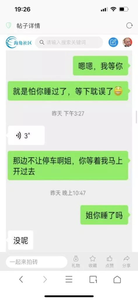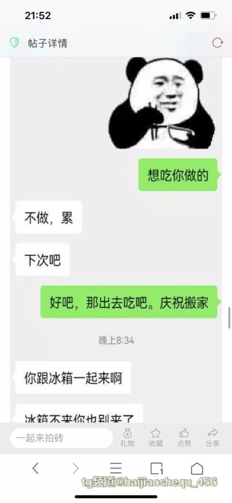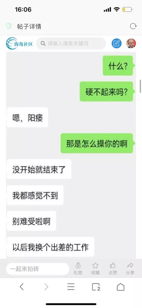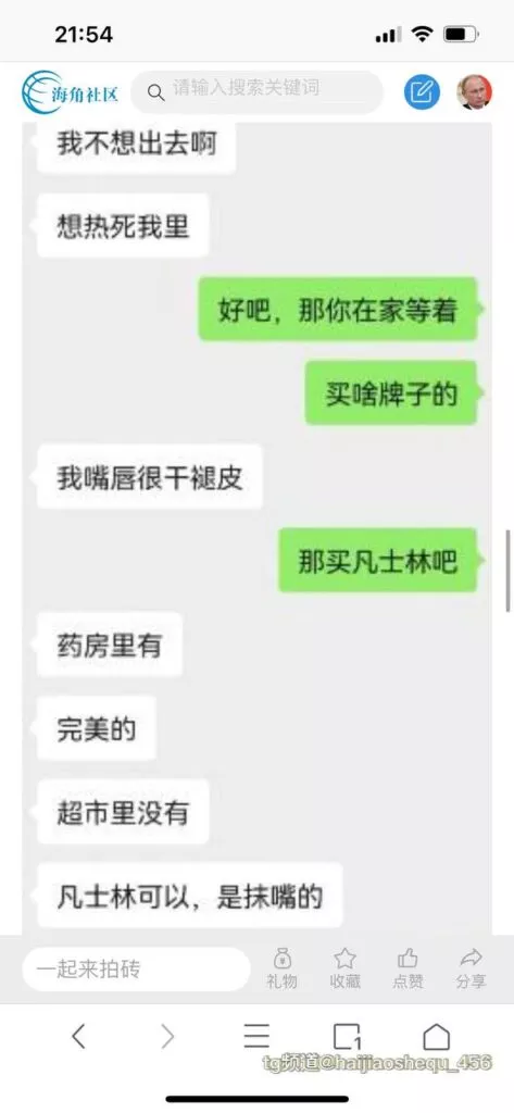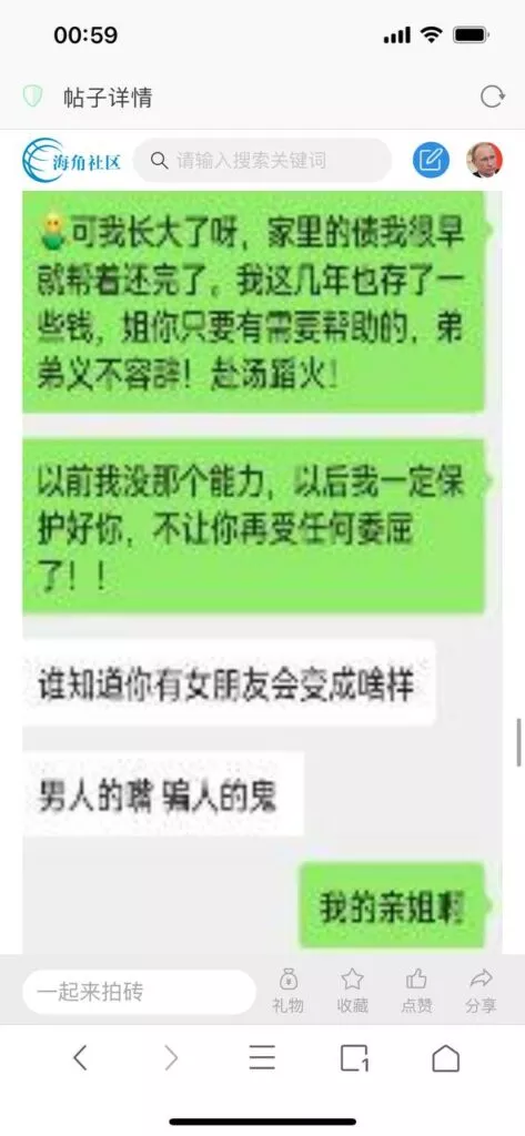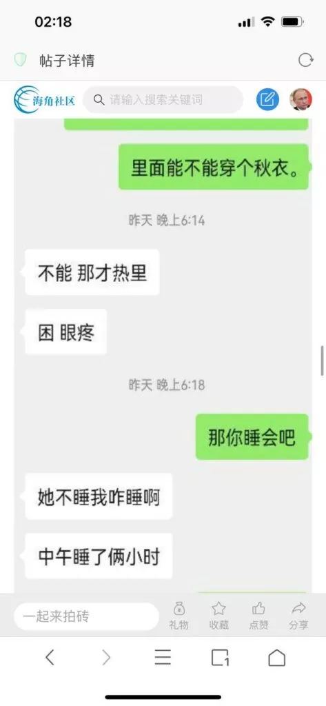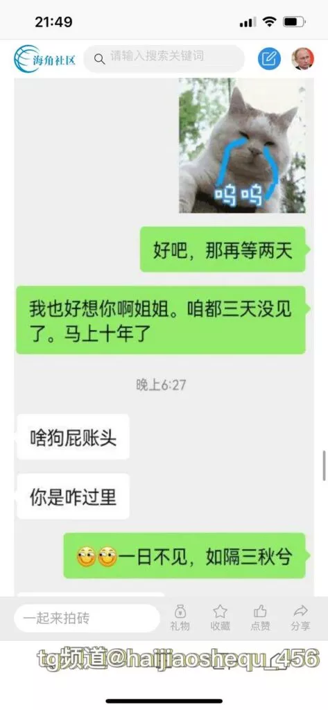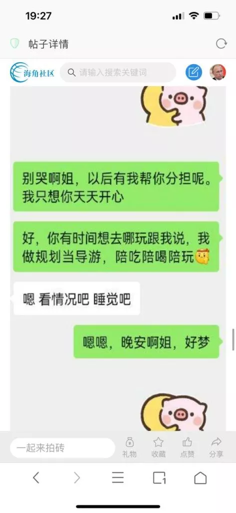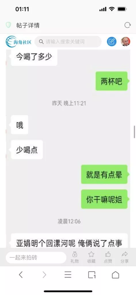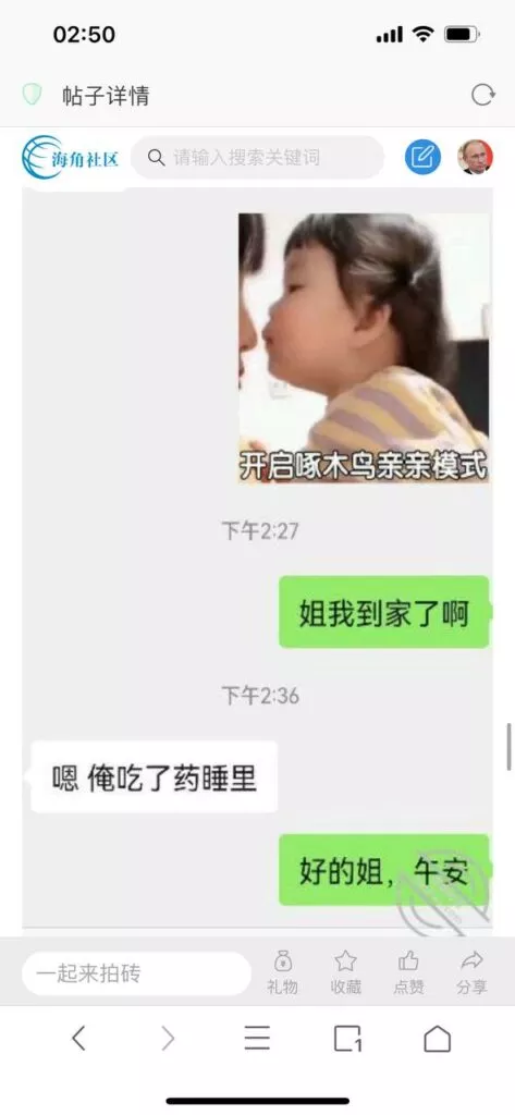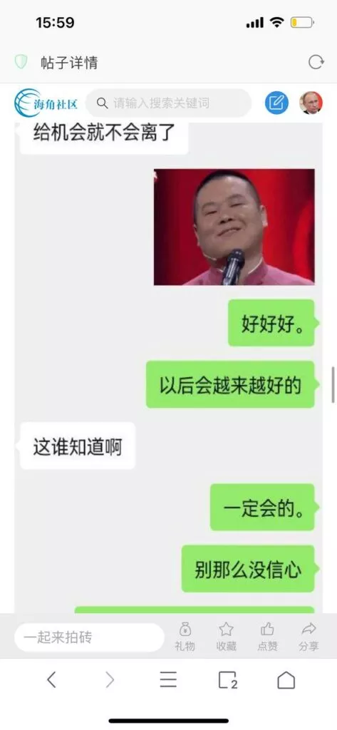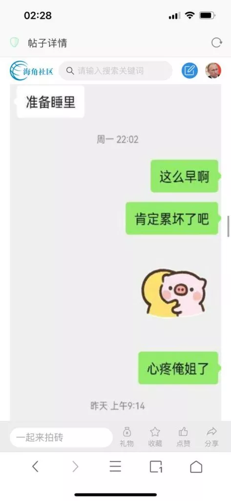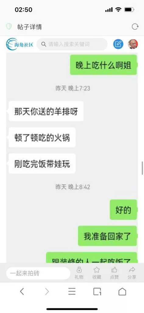 今天看电影也在犹豫要不要发一个视频。但也是我的锅,前几天晚上喝多了跟一个加我微信的海友打了微信电话,haijiaoshequ_456天南海北聊了快一个小时,脑子一热就答应了有机会再发一个帖。