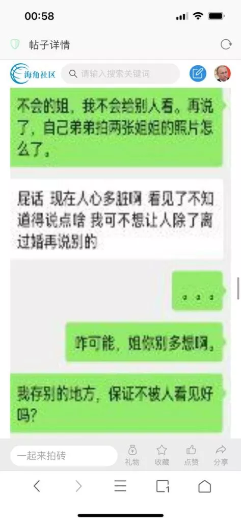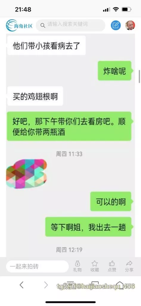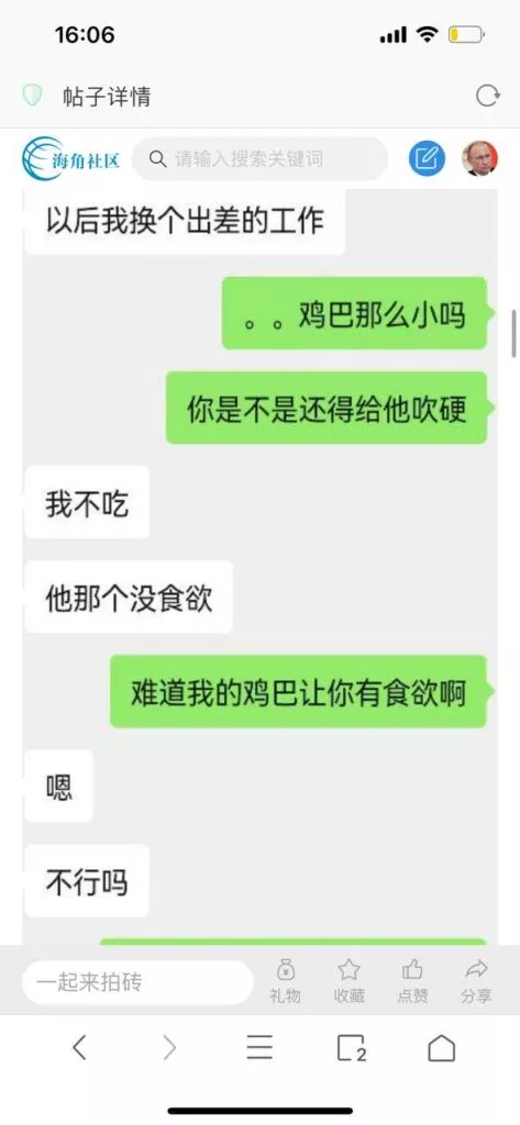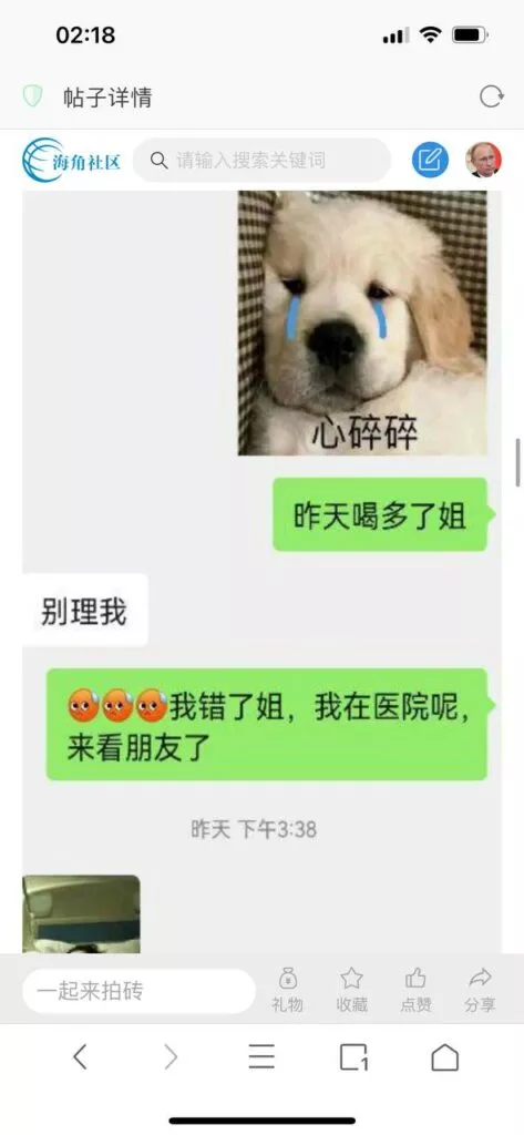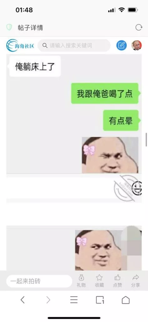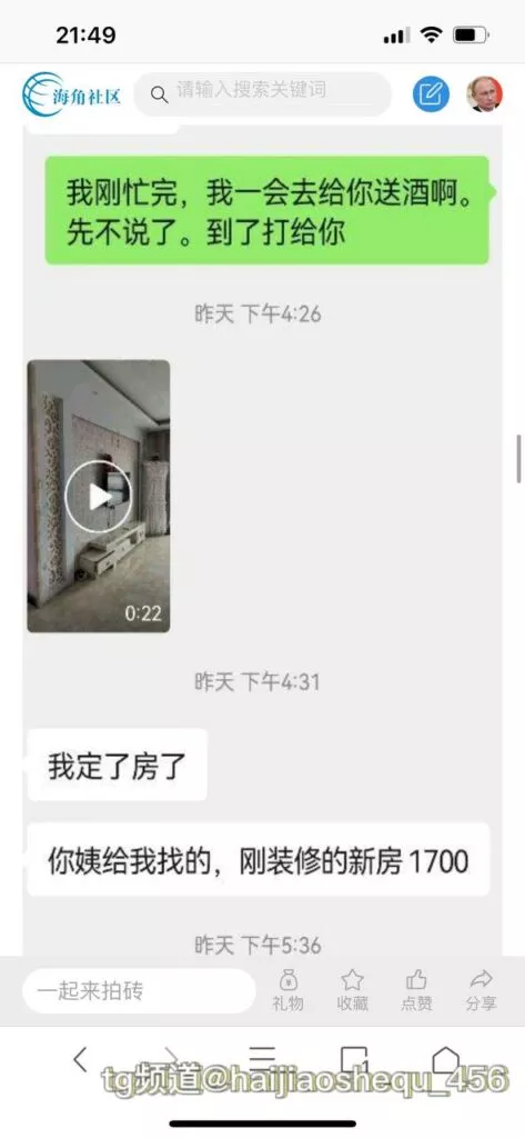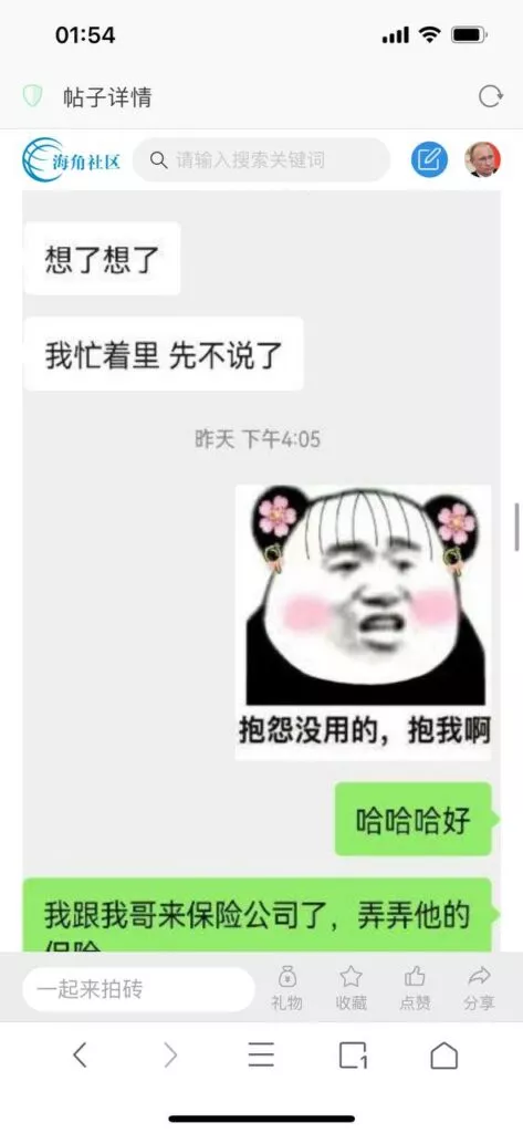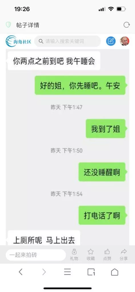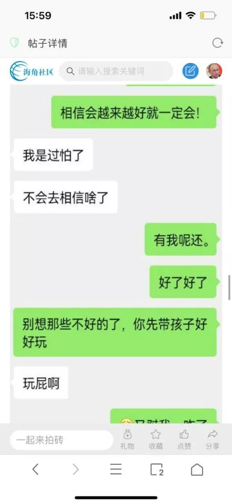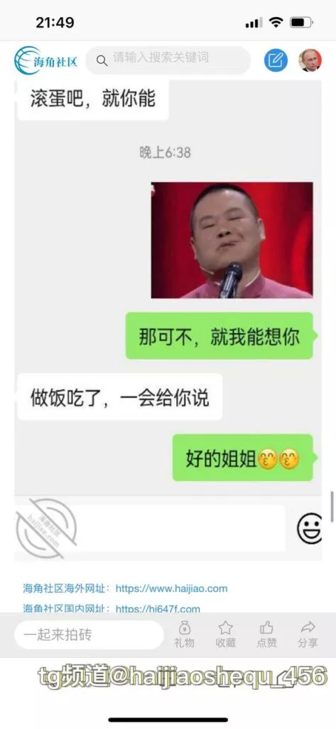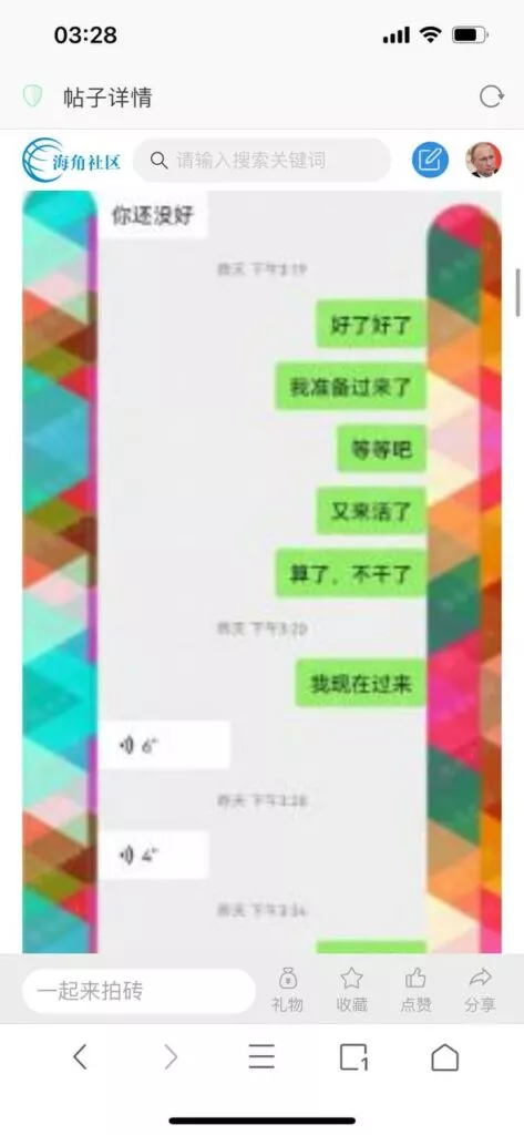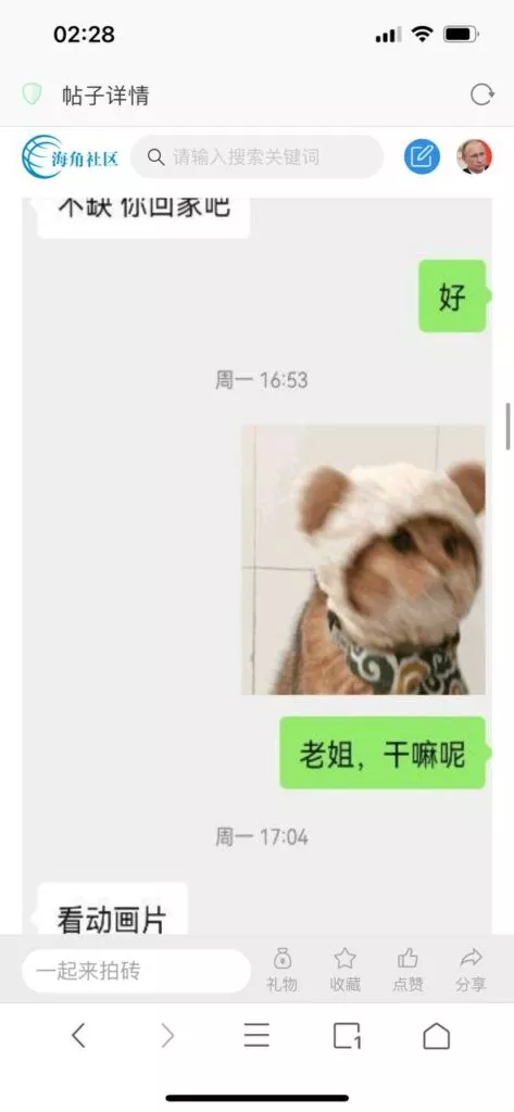 今天看电影也在犹豫要不要发一个视频。但也是我的锅,前几天晚上喝多了跟一个加我微信的海友打了微信电话,haijiaoshequ_456天南海北聊了快一个小时,脑子一热就答应了有机会再发一个帖。