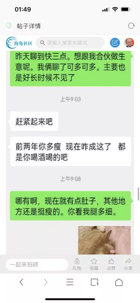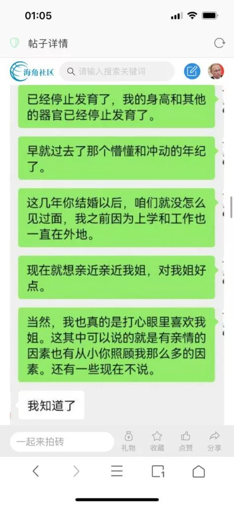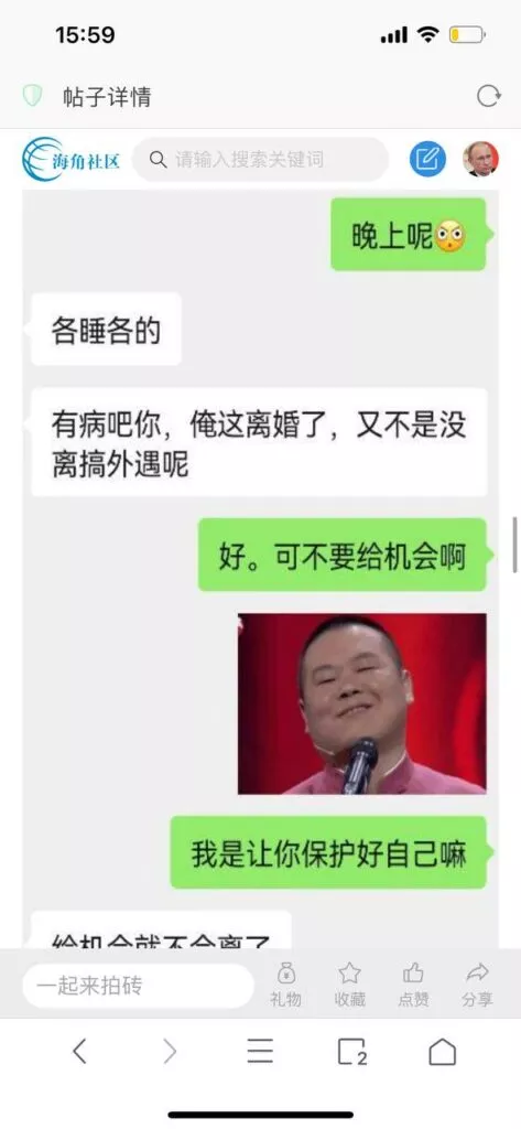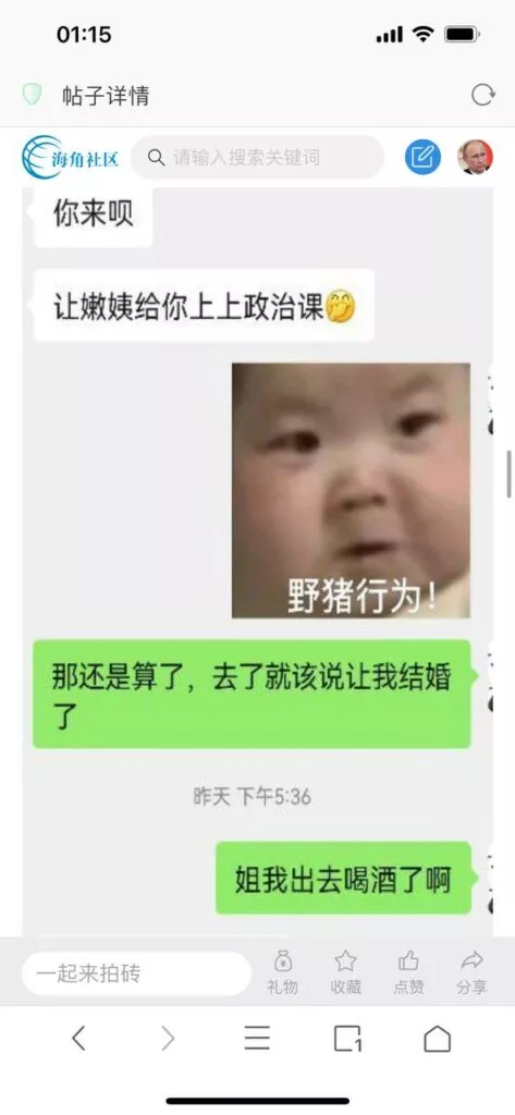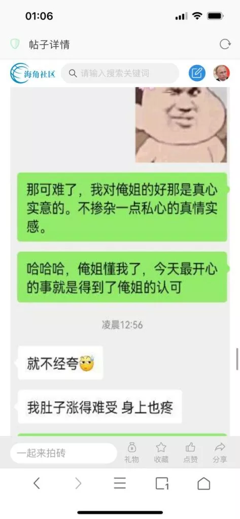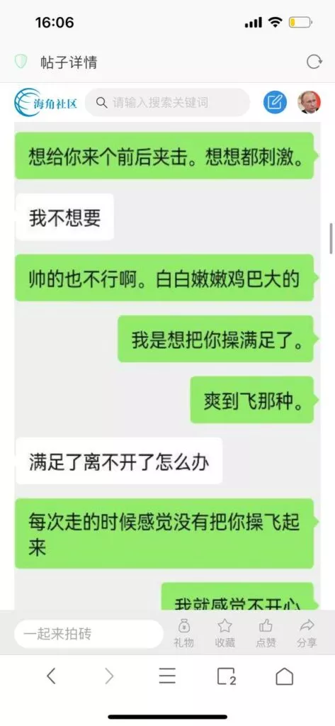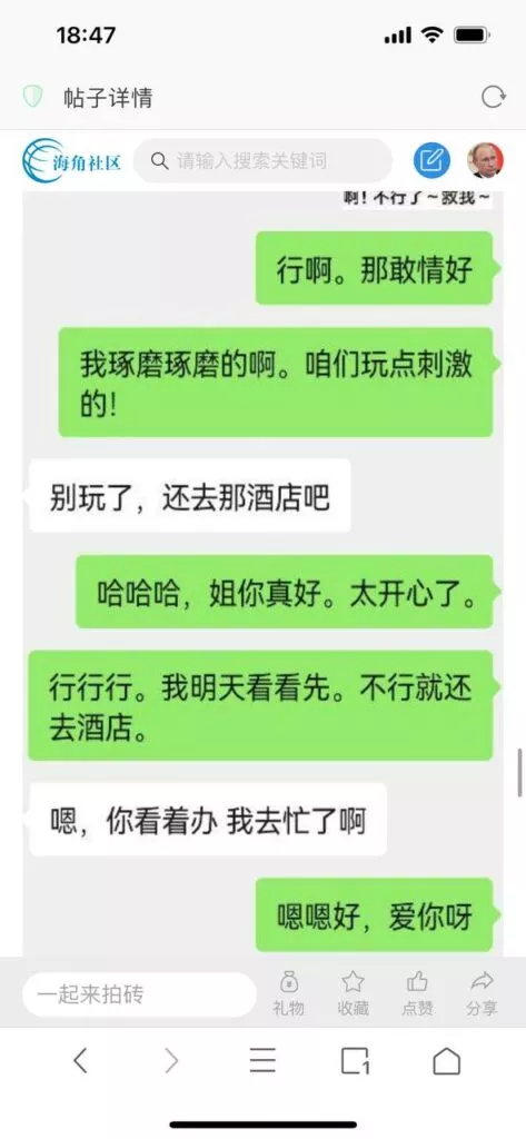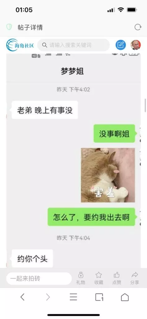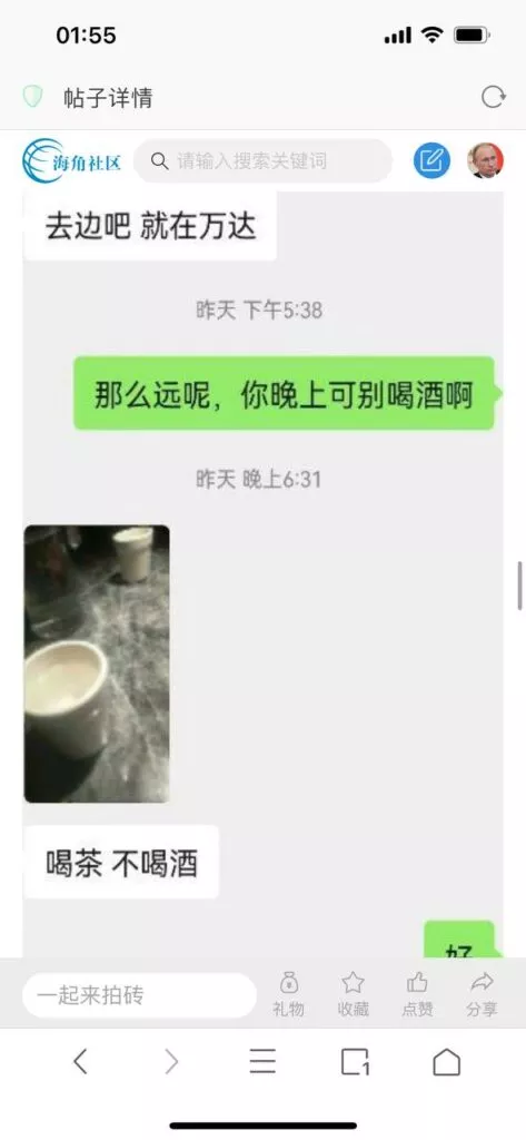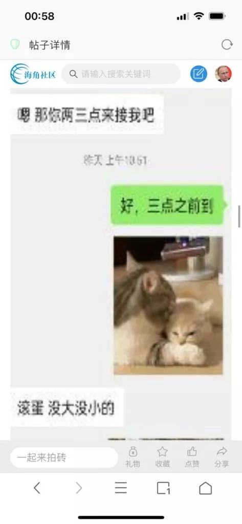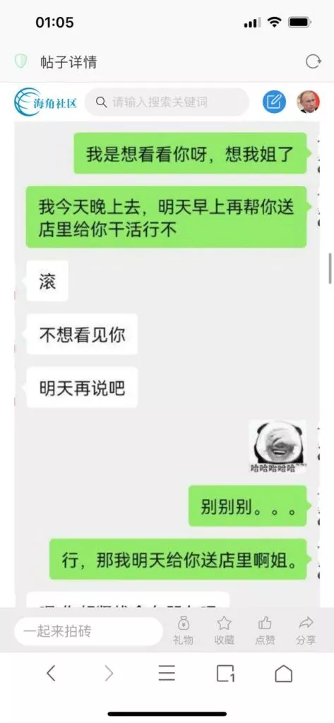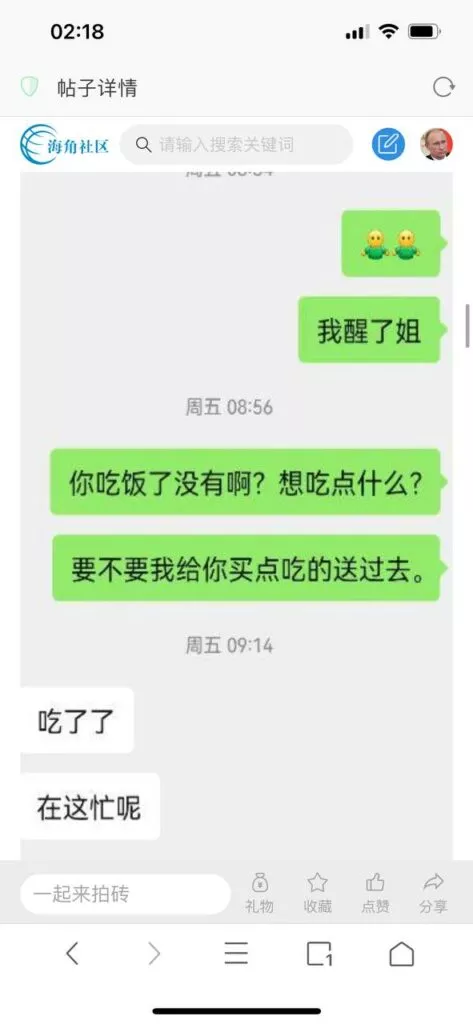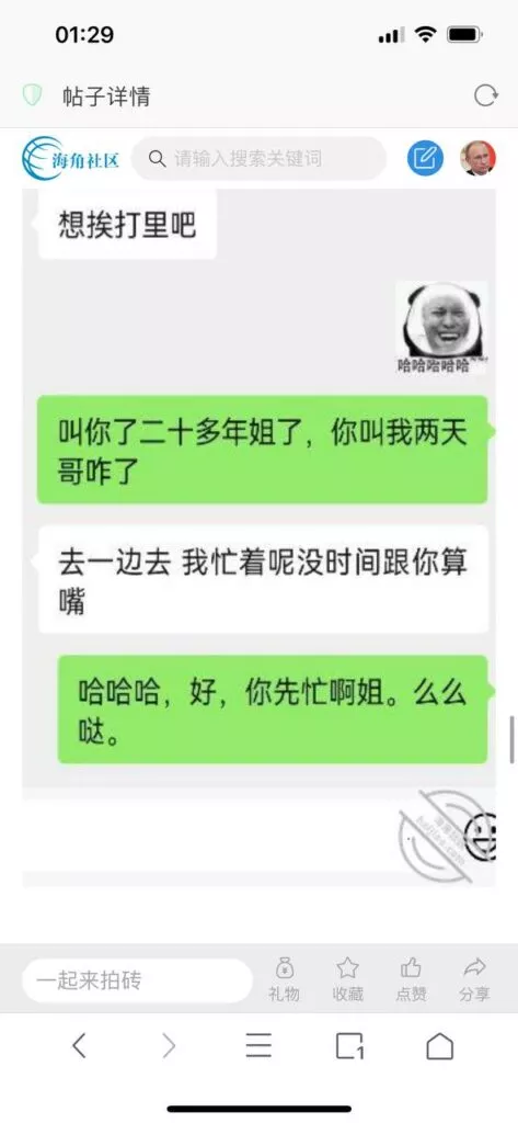 今天看电影也在犹豫要不要发一个视频。但也是我的锅,前几天晚上喝多了跟一个加我微信的海友打了微信电话,haijiaoshequ_456天南海北聊了快一个小时,脑子一热就答应了有机会再发一个帖。