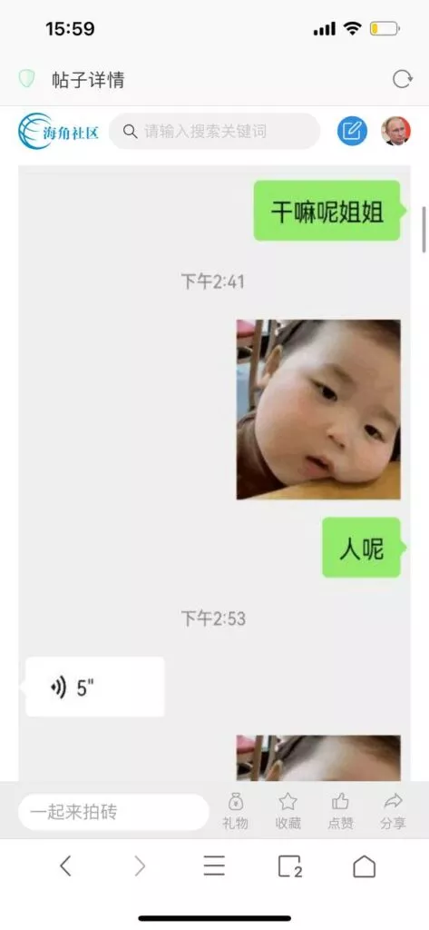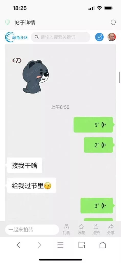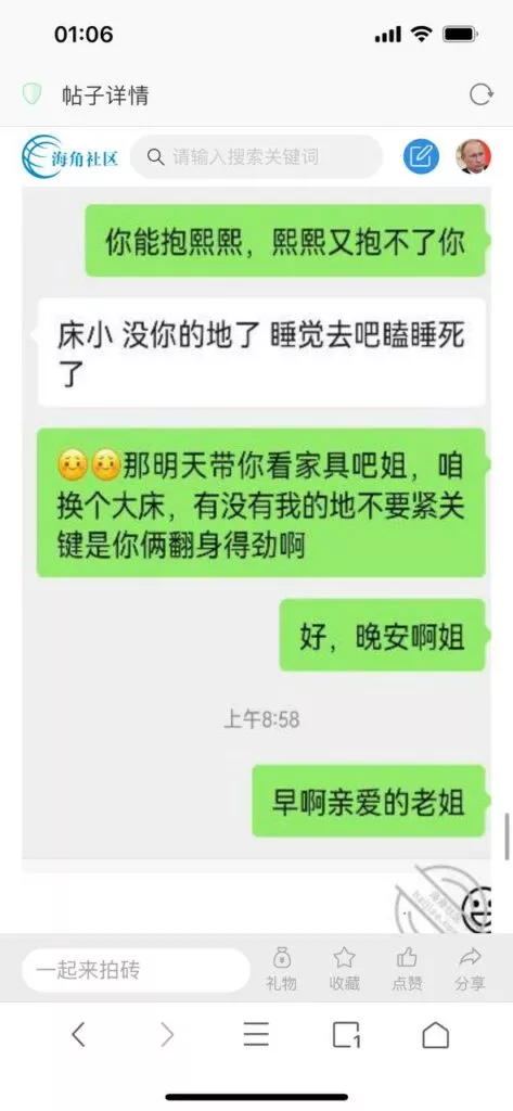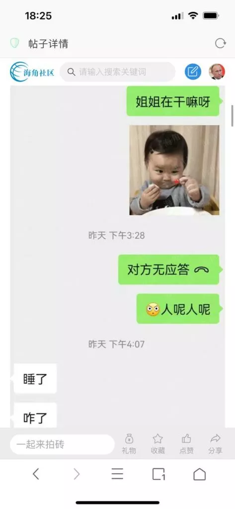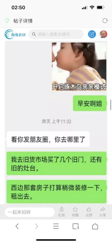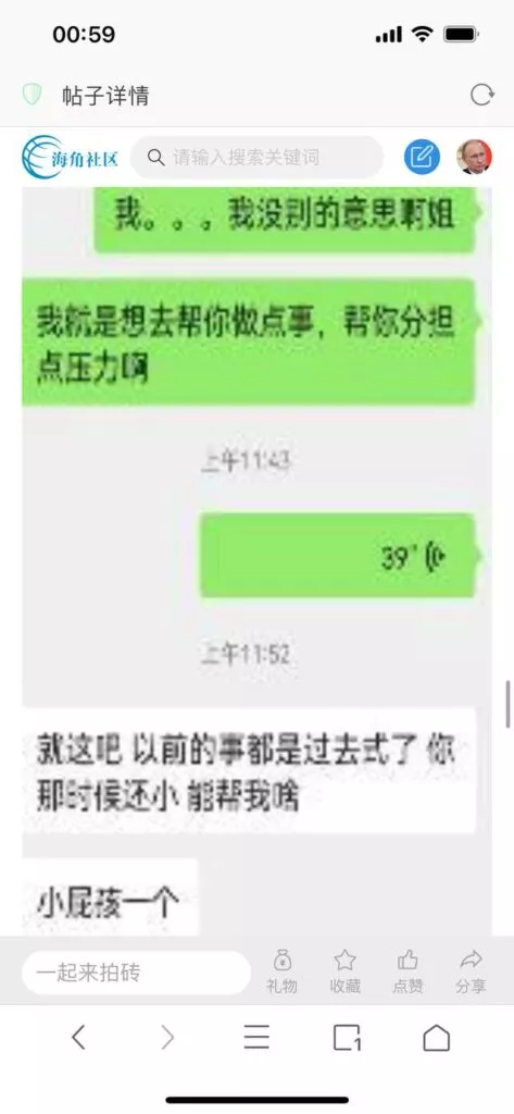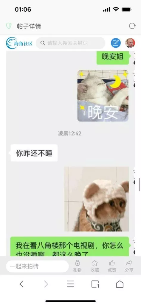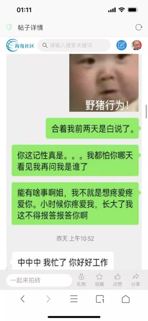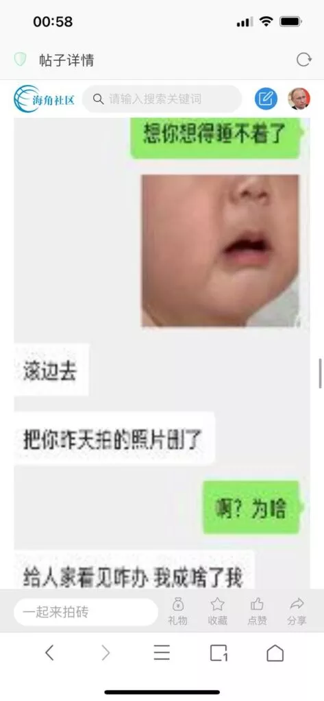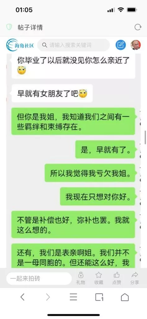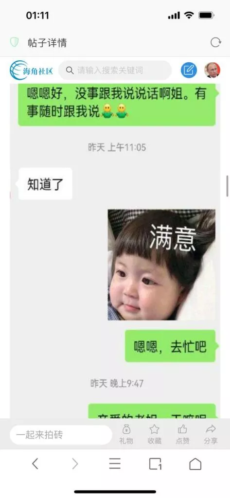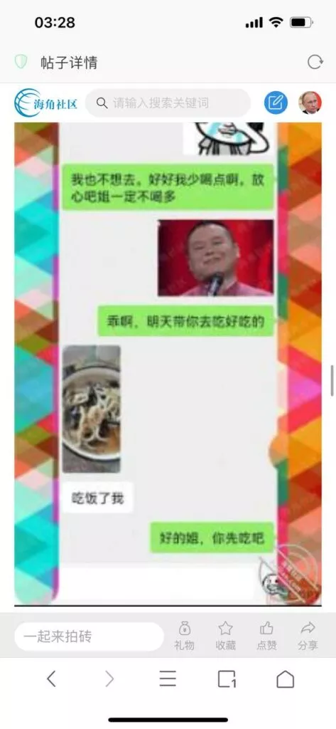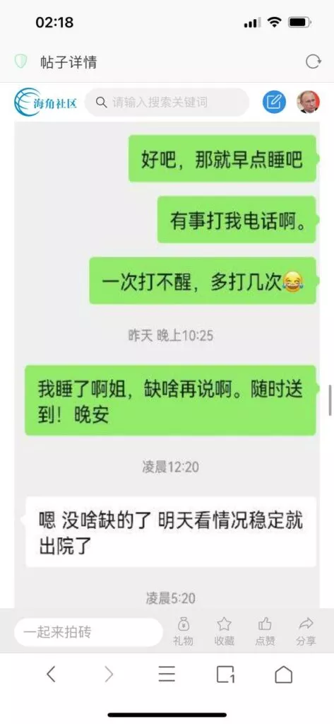 今天看电影也在犹豫要不要发一个视频。但也是我的锅,前几天晚上喝多了跟一个加我微信的海友打了微信电话,haijiaoshequ_456天南海北聊了快一个小时,脑子一热就答应了有机会再发一个帖。