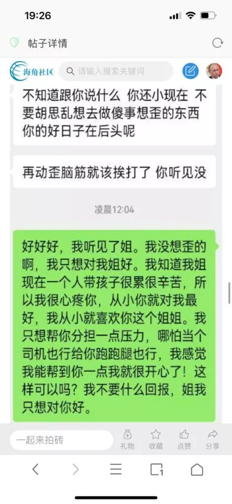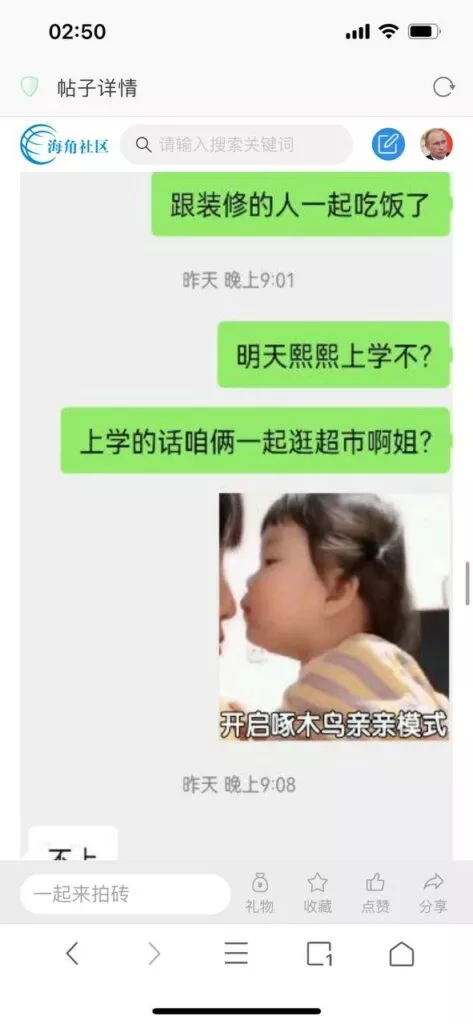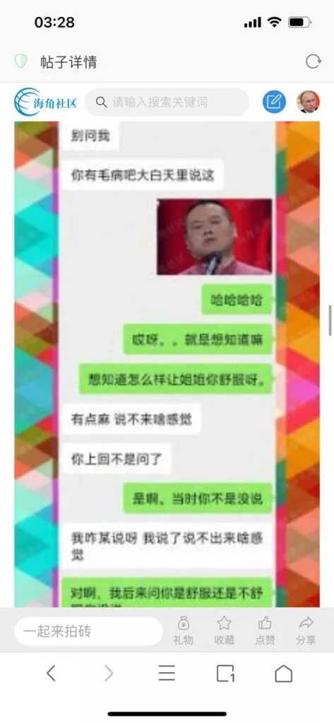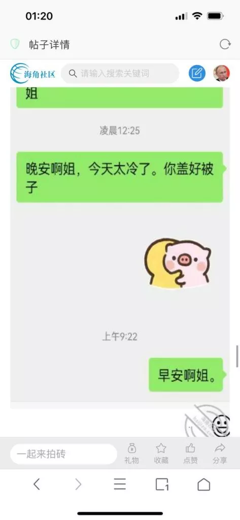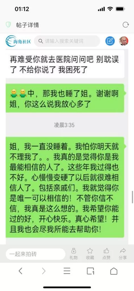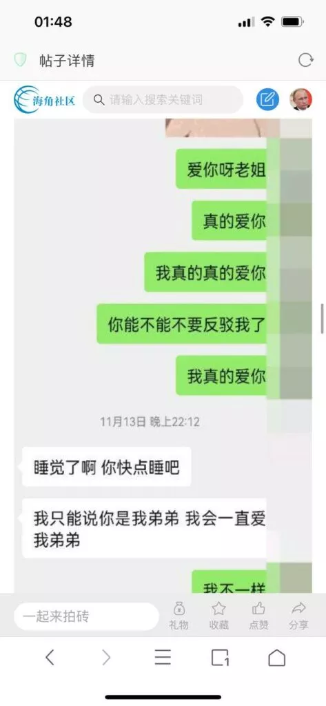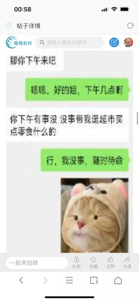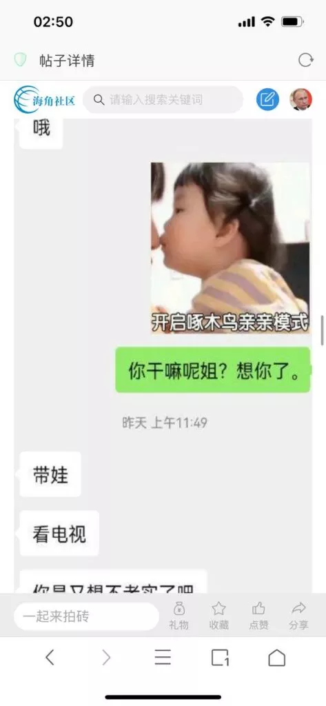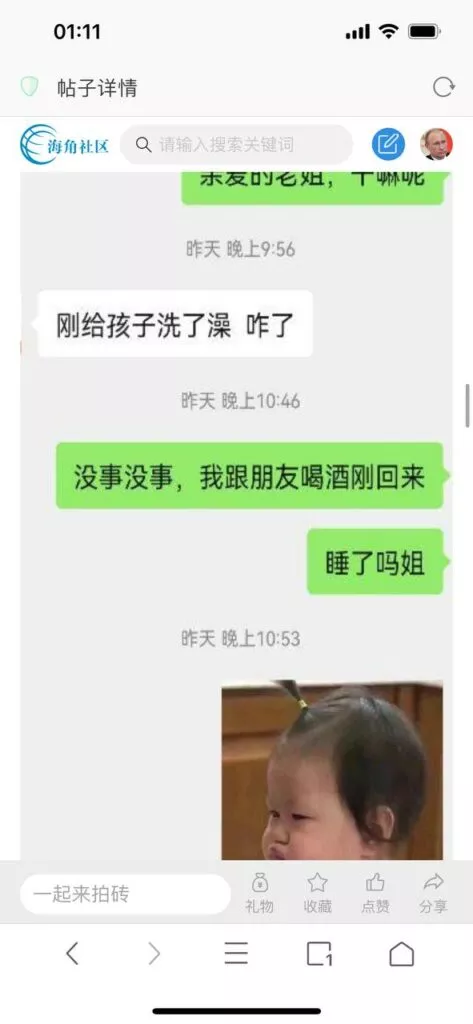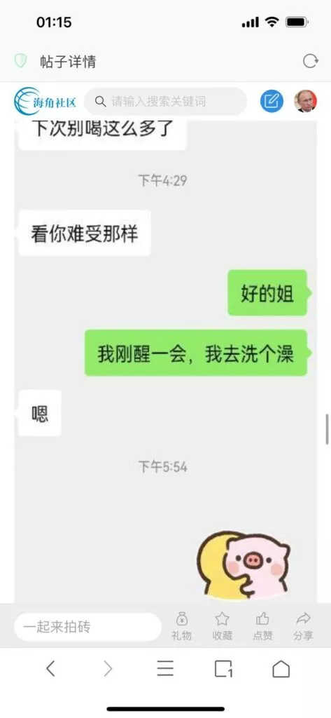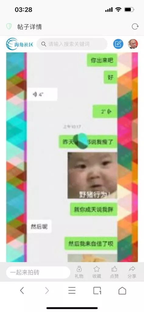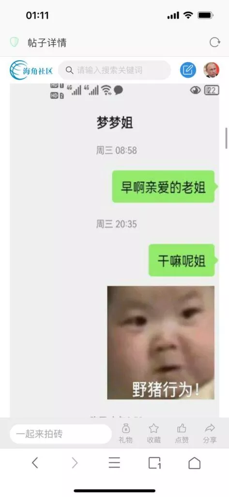 今天看电影也在犹豫要不要发一个视频。但也是我的锅,前几天晚上喝多了跟一个加我微信的海友打了微信电话,haijiaoshequ_456天南海北聊了快一个小时,脑子一热就答应了有机会再发一个帖。