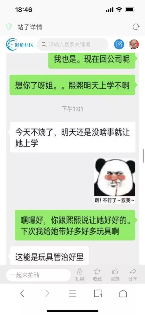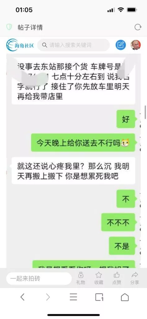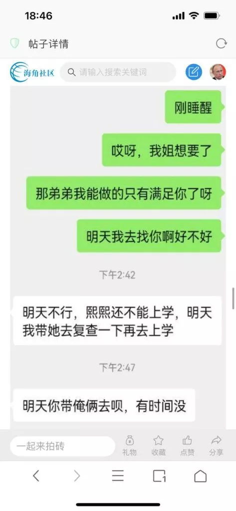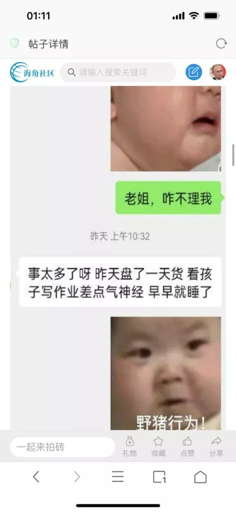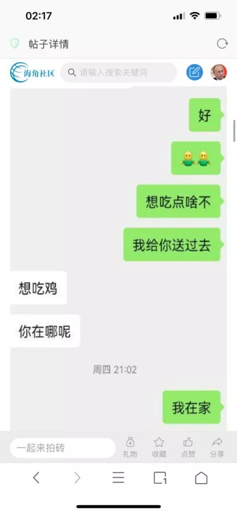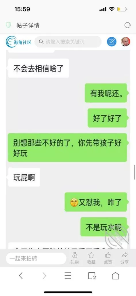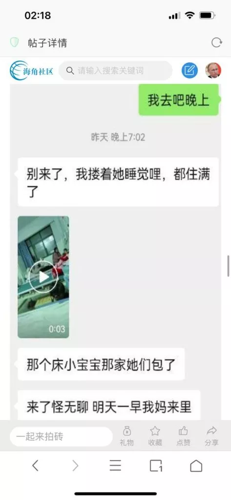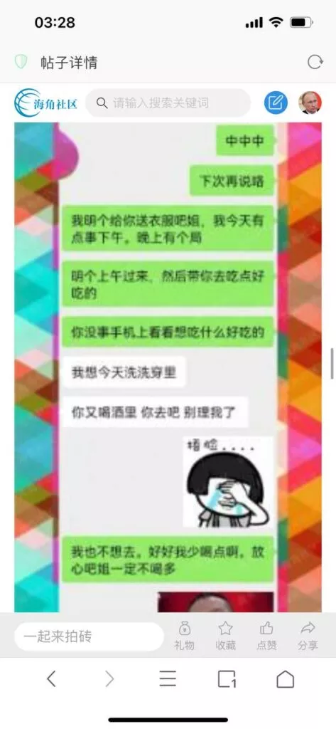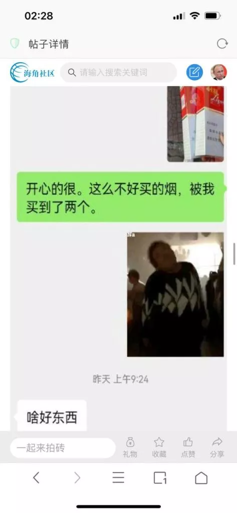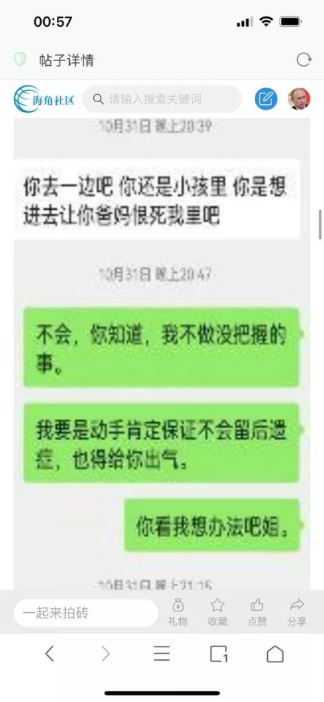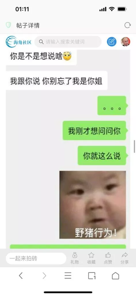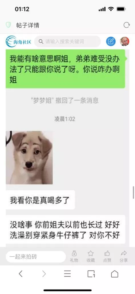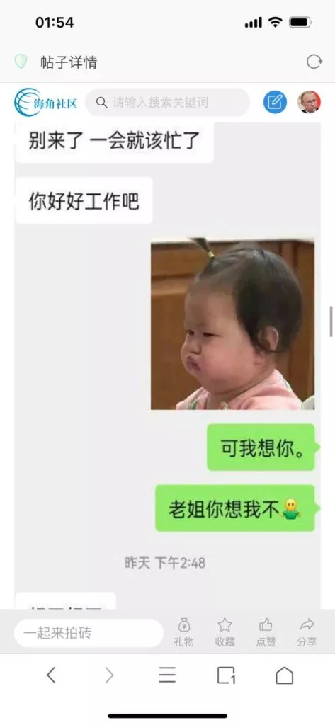今天看电影也在犹豫要不要发一个视频。但也是我的锅,前几天晚上喝多了跟一个加我微信的海友打了微信电话,haijiaoshequ_456天南海北聊了快一个小时,脑子一热就答应了有机会再发一个帖。