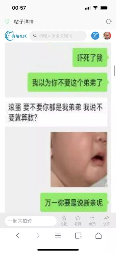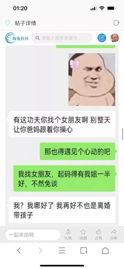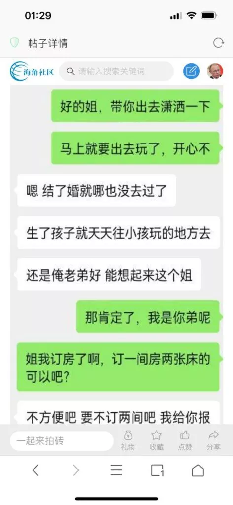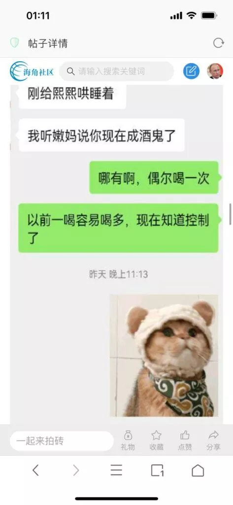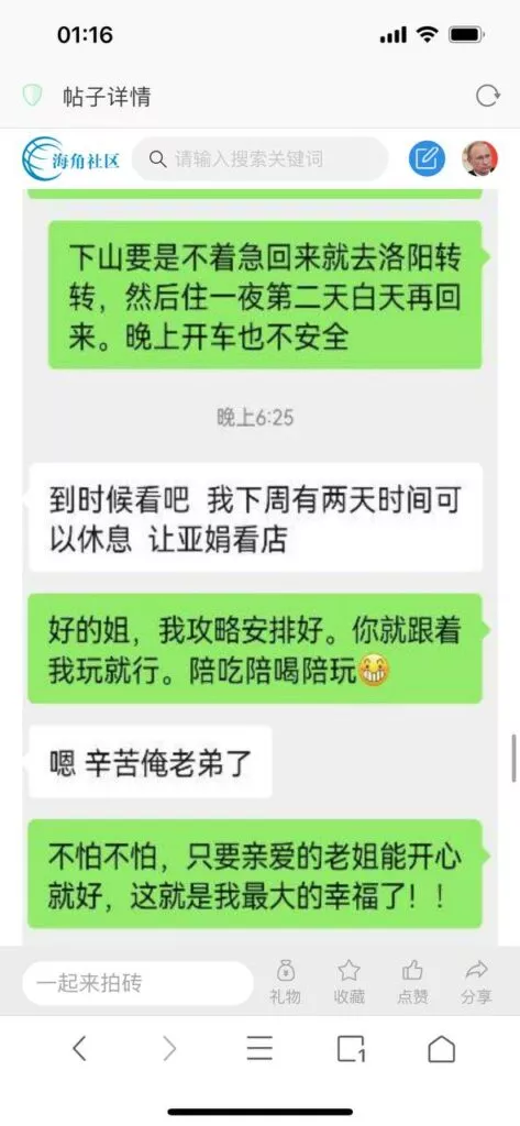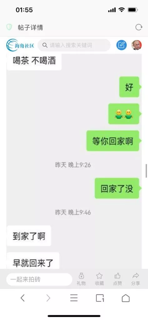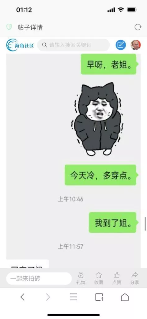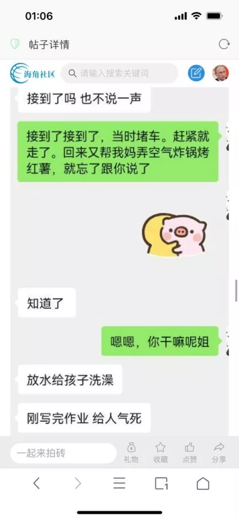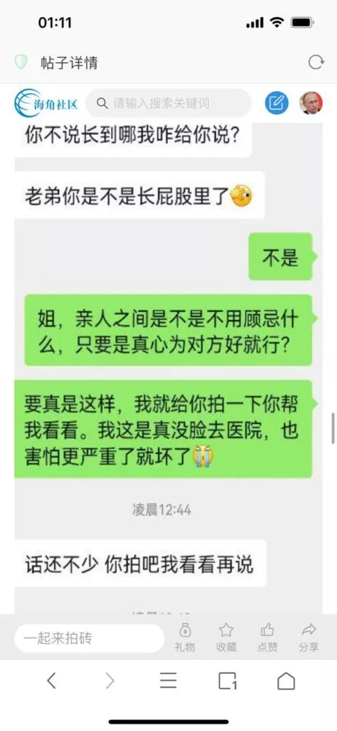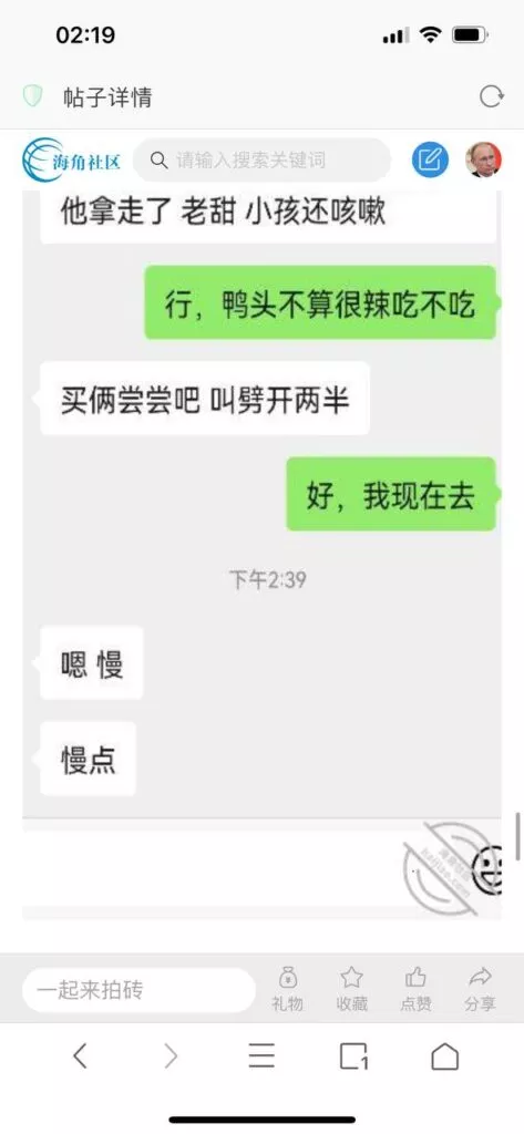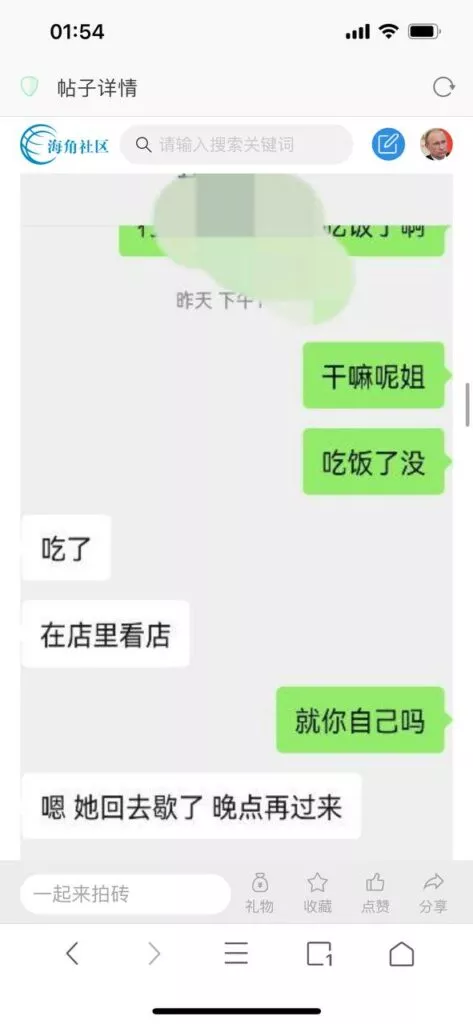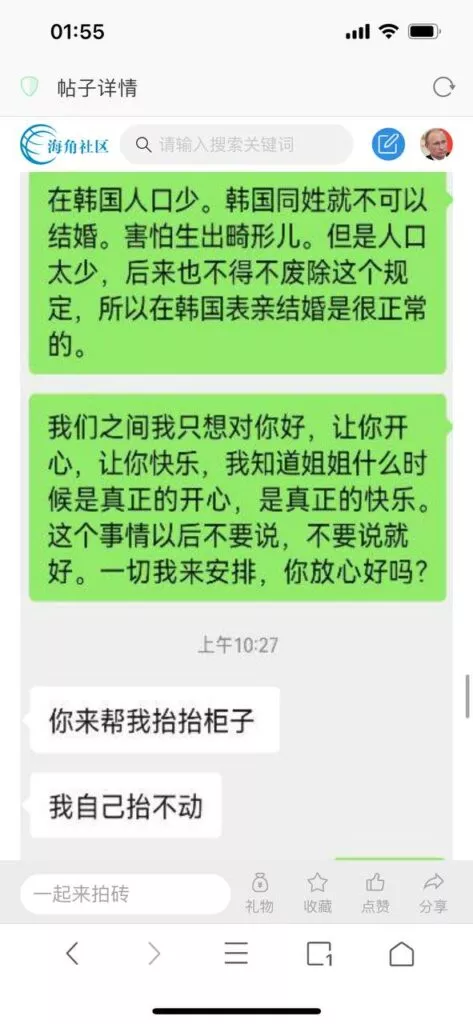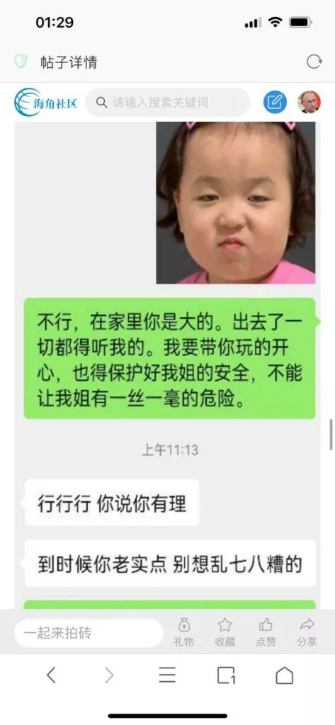 今天看电影也在犹豫要不要发一个视频。但也是我的锅,前几天晚上喝多了跟一个加我微信的海友打了微信电话,haijiaoshequ_456天南海北聊了快一个小时,脑子一热就答应了有机会再发一个帖。