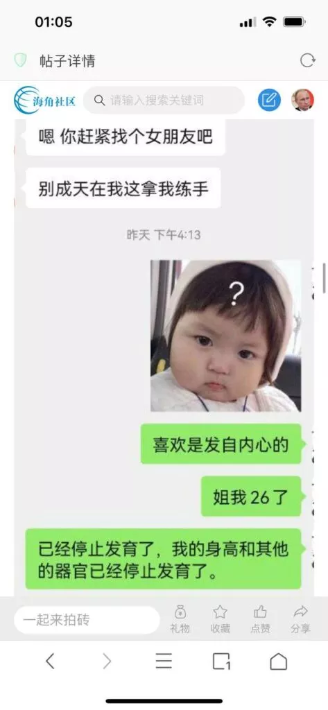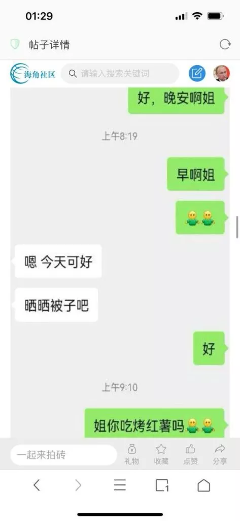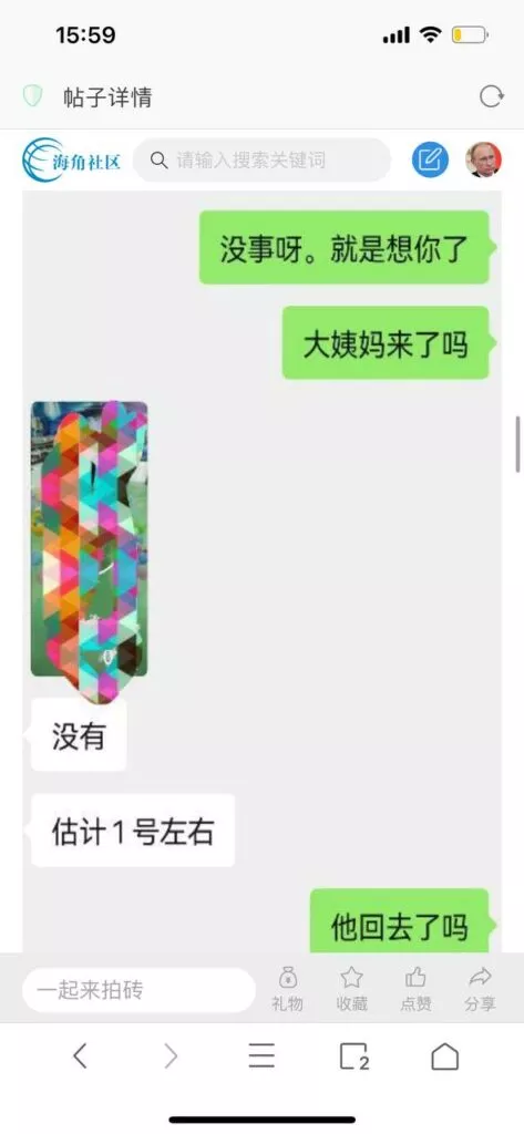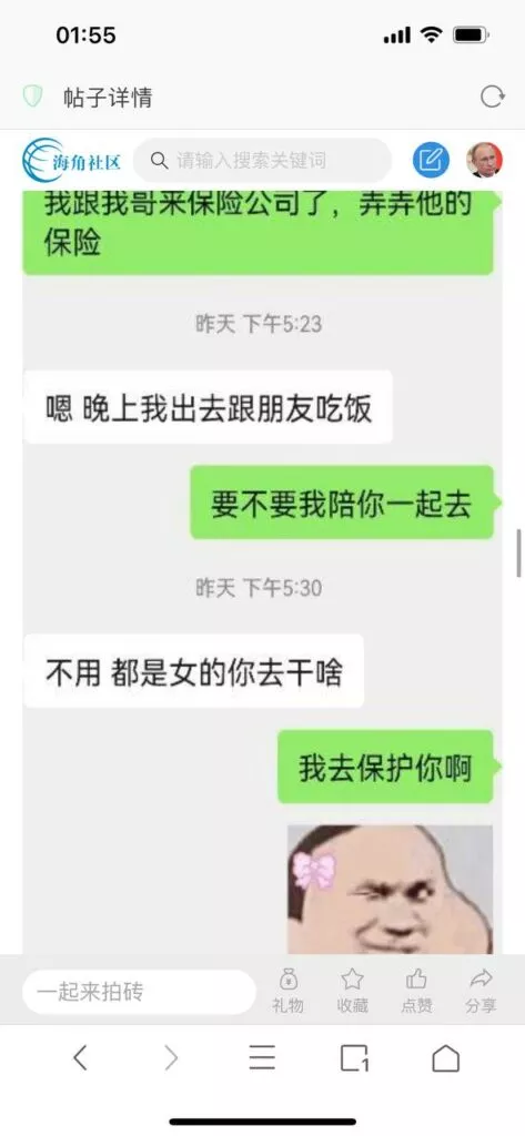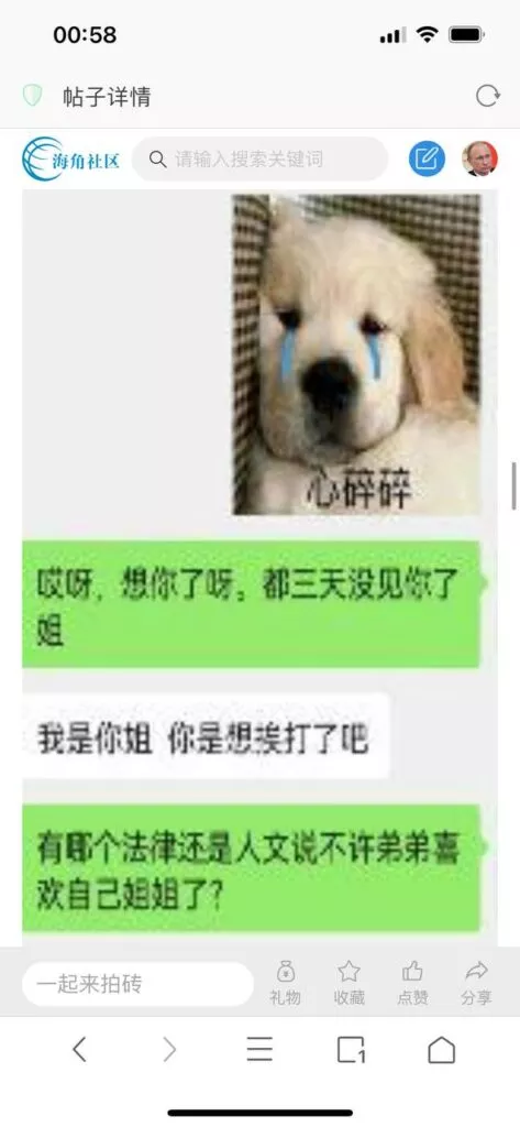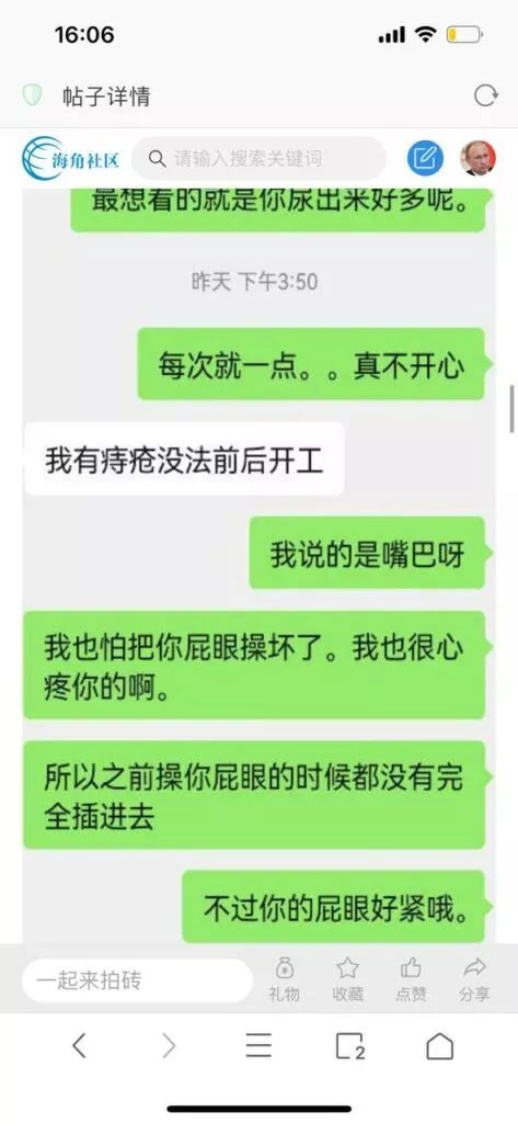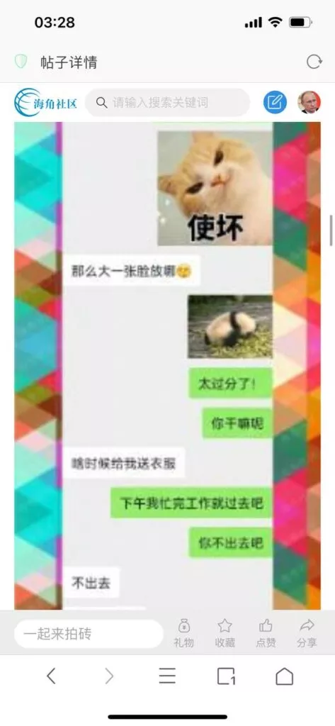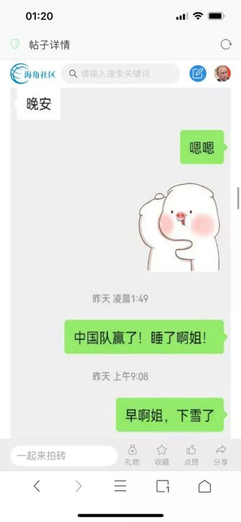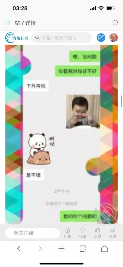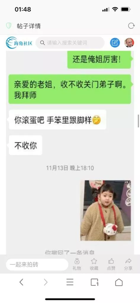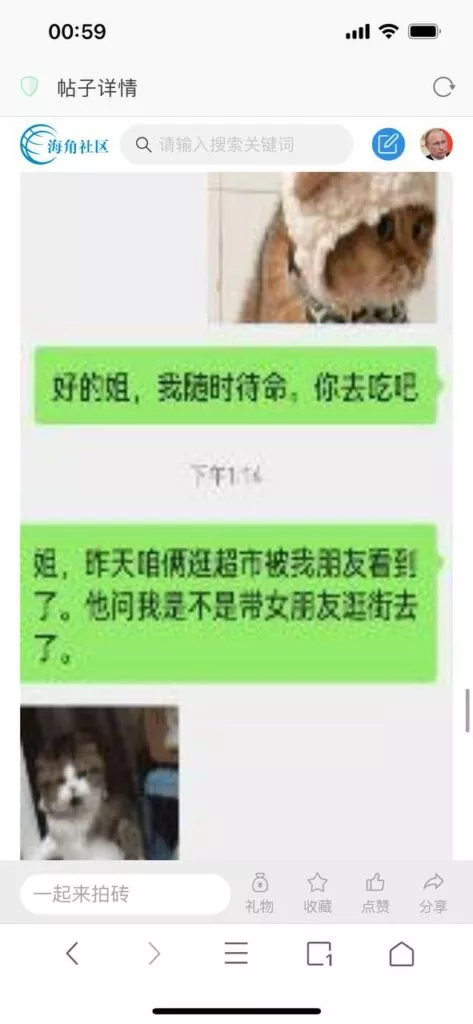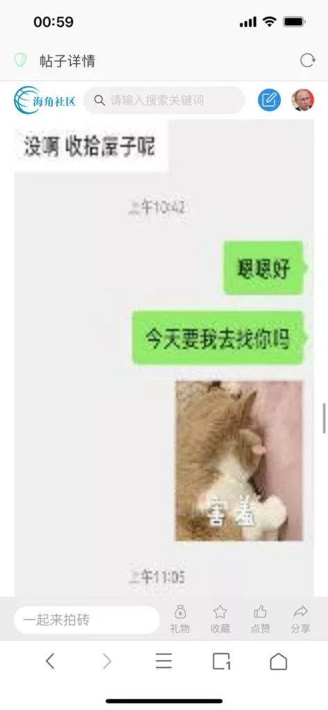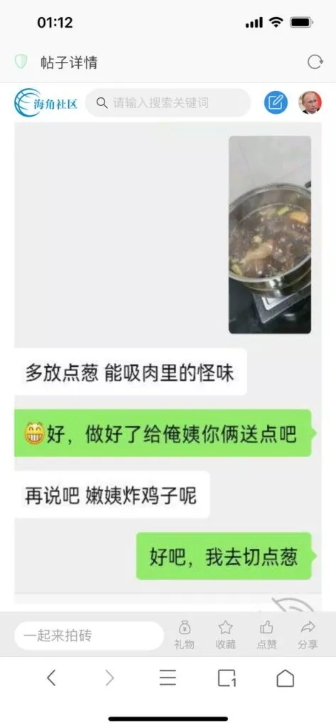 今天看电影也在犹豫要不要发一个视频。但也是我的锅,前几天晚上喝多了跟一个加我微信的海友打了微信电话,haijiaoshequ_456天南海北聊了快一个小时,脑子一热就答应了有机会再发一个帖。