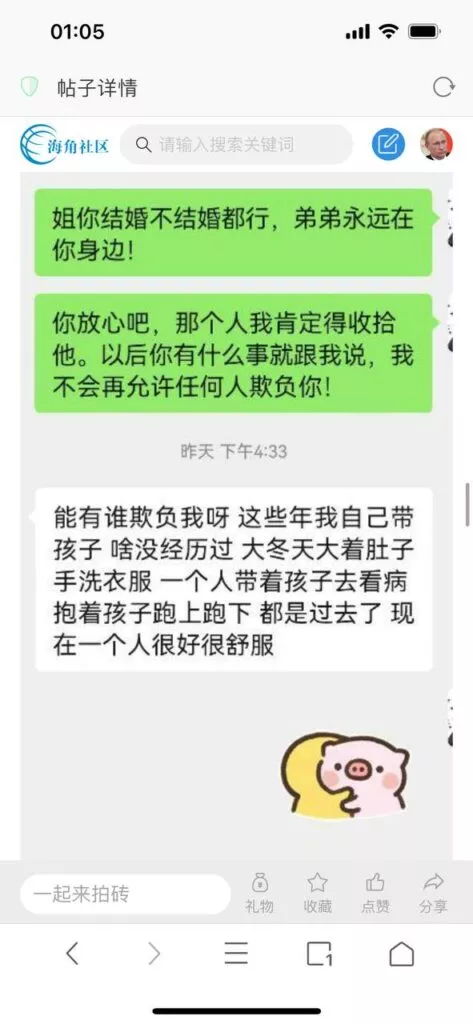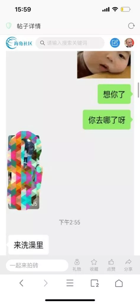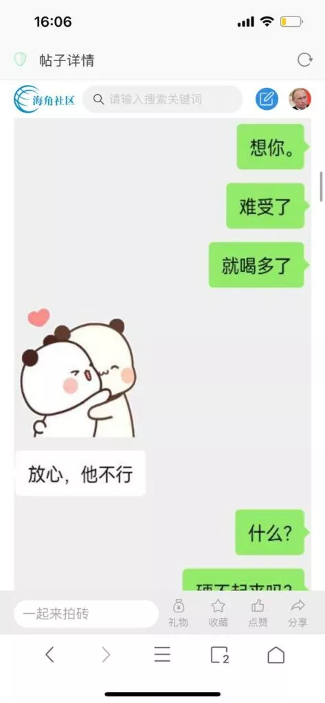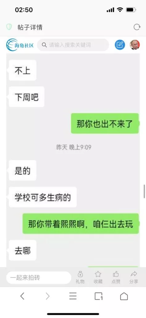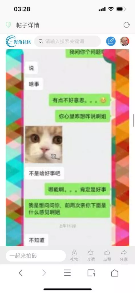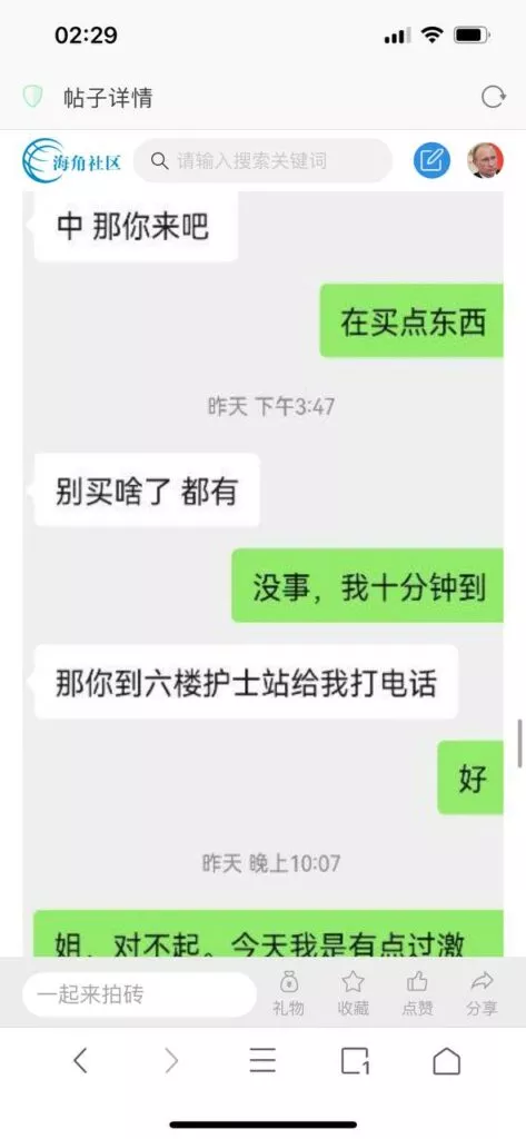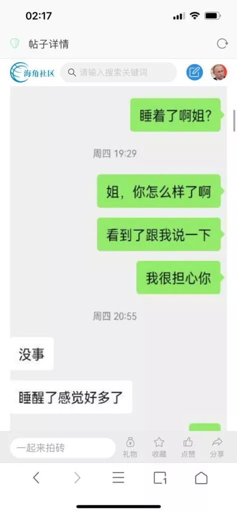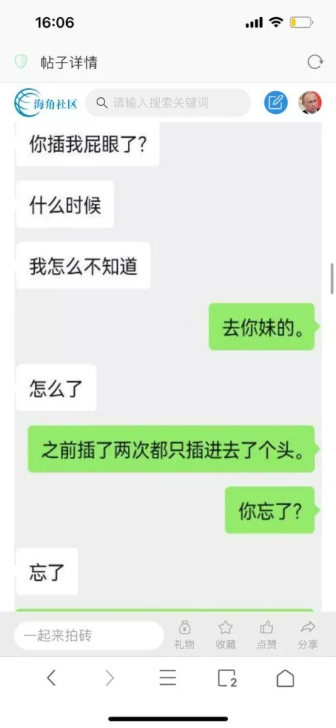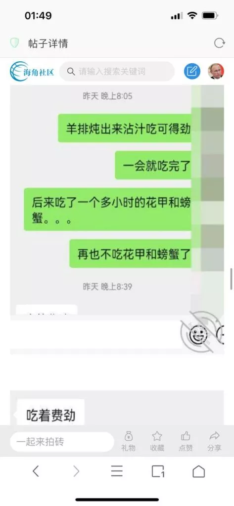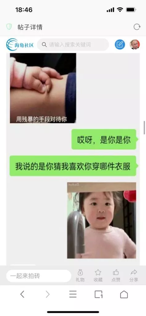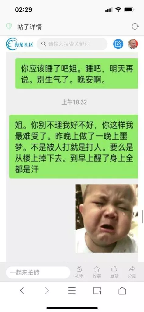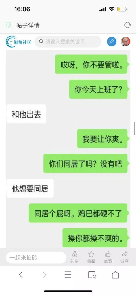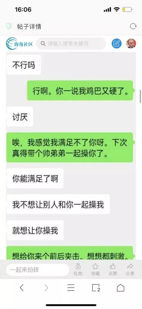 今天看电影也在犹豫要不要发一个视频。但也是我的锅,前几天晚上喝多了跟一个加我微信的海友打了微信电话,haijiaoshequ_456天南海北聊了快一个小时,脑子一热就答应了有机会再发一个帖。