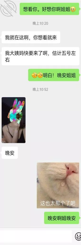 我想看一张她洗完澡的照片。一开始我以为不会给呢。没想到她竟然不理我是去给我拍了。好鸡冻啊!而且她说大姨妈快来了,是要暗示我要趁这几天做i吗?还是说可以体内释放了。