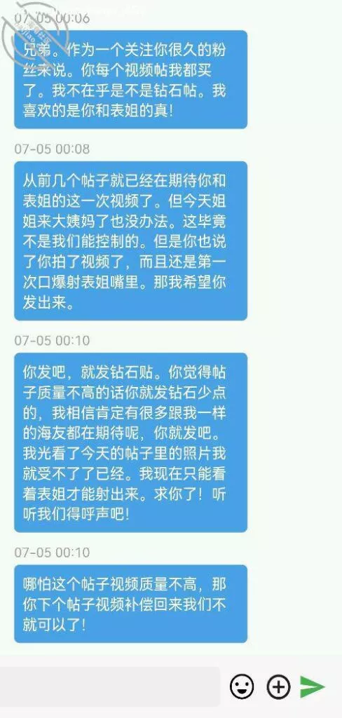 但是帖子发不出去私信也回复不了了。今天咬牙跺脚的冲了个会员。。不亏吧,一天能私信一千条。那些私信我的兄弟,我会跟你聊聊,确认安全的情况下我会把表姐的露脸照片发给你。