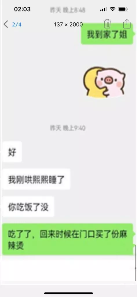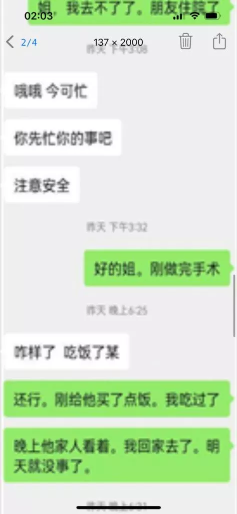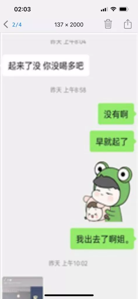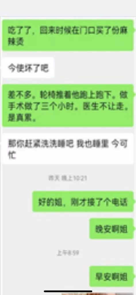 昨晚没有跟我姐聊,到家跟她说了一声躺着就睡着了,衣服都没有脱。早上七点多尿憋醒了,起来看见我姐凌晨五点给我发信息了。我估摸着那时候她也是醒来了,担心我给我发了个信息。然后我说我饿了,也懒得出去吃饭了不想动弹。