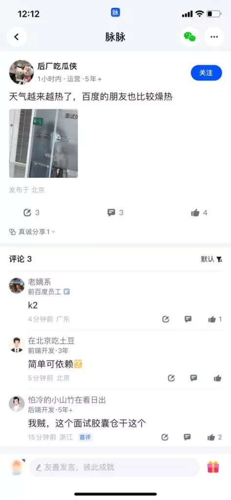 这年头程序员面试,除了要考验大头,还要考验小头么?网传互联网大厂百度办公大楼里,疑似百度下属员工一男一女,竟然在静音舱做出大尺度不雅行为,果然搞互联网的思维就是前卫,怎么都能来一发。