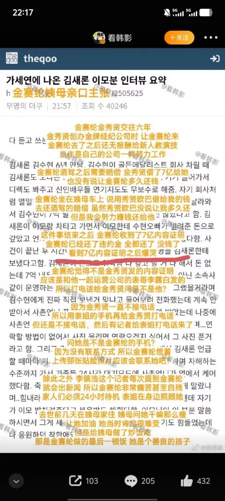 金塞纶曾经因为酒驾陷入巨额赔偿,并且因为事件恶劣导致事业停滞陷入困顿,因此找到了金秀贤借了7亿韩元,但之后也因为酒驾事件没有合作或者出演项目,毫无收入可言,金秀贤却在她最困难的时候开始要债