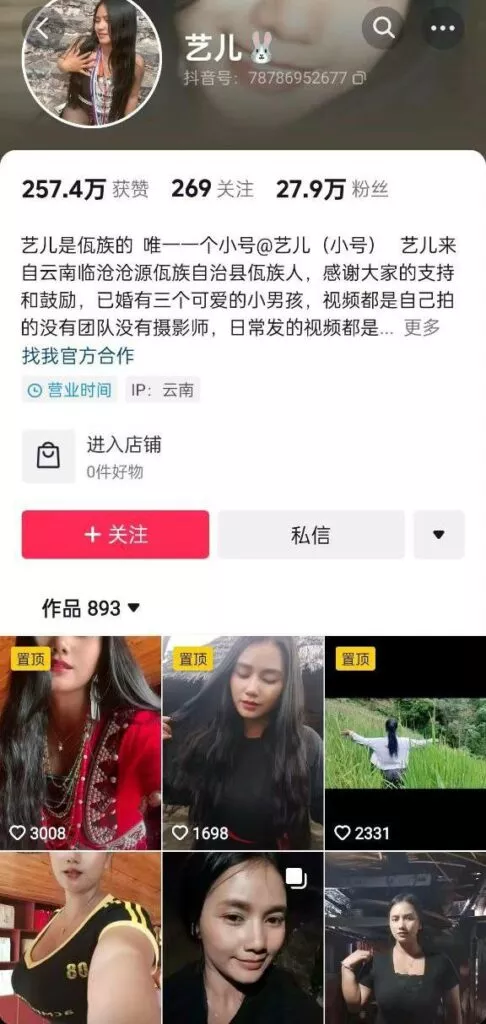 一位来自佤族的少数民族网红,昵称艺儿。特点就是硕大的匈部,自述已有三个孩子,但自从掌握流量密码之后,画风就变了,不仅学会了擦边,还学会了怎么迅速累积粉丝,甚至搞了一次真空直播。