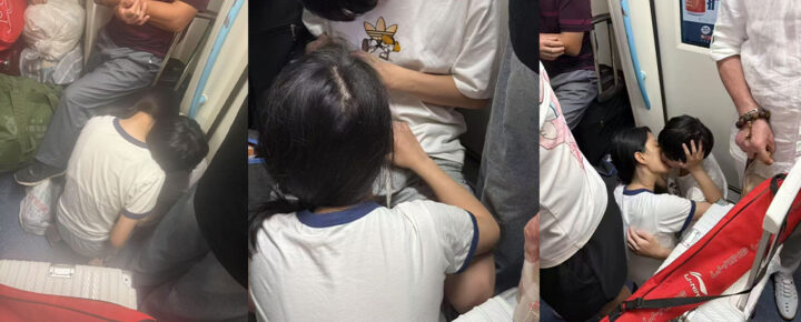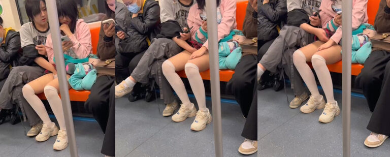 两位当事人似乎将周围的路人视为他们表演的一部分。在地铁上人流密集的情况下,他们竟然能做出如此不雅的行为。男子的手不断在女子的双腿之间游走,甚至连她的内裤都清晰可见。