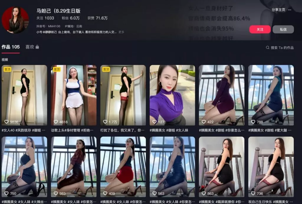 抖音上的少妇与御姐形象的网红马妲己,以高挑的身材与成熟知性风范吸引了越来越多的关注,逐渐积累了不少流量。然而,近日却有消息曝出,她在私下里竟涉足皮肉生意,甚至还有大尺度私拍视频流出,引发了广泛的讨论。