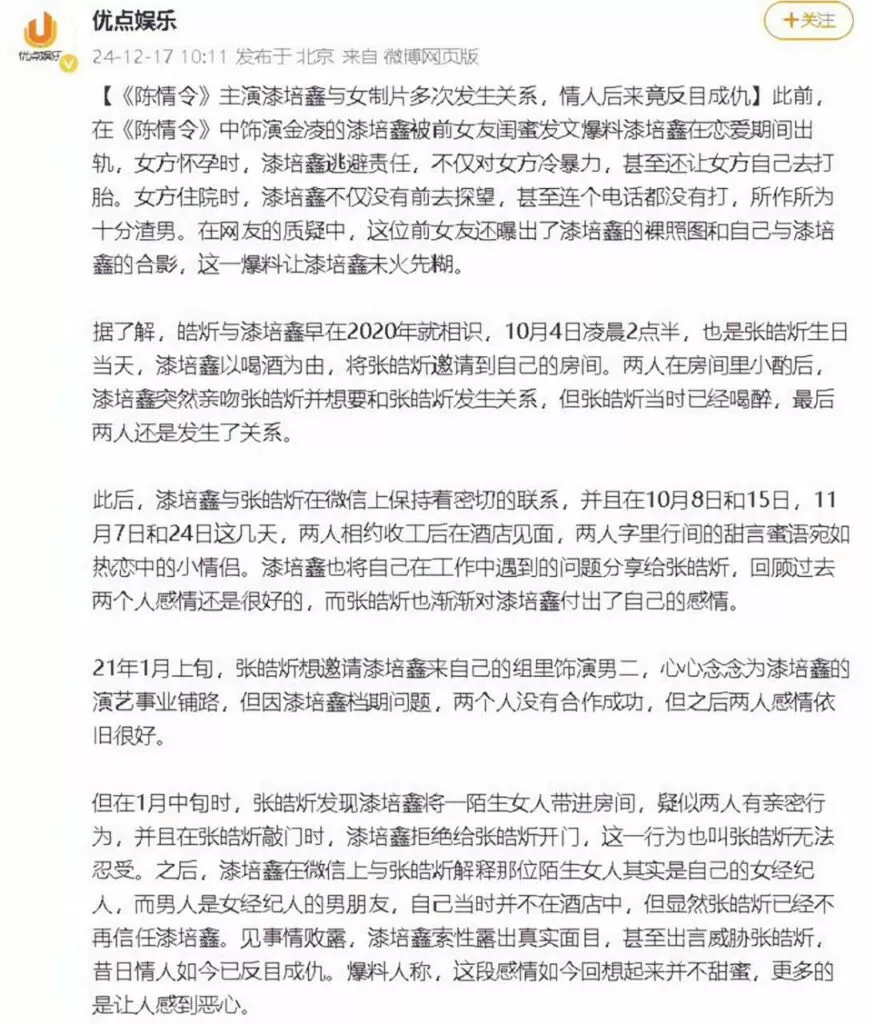 在《陈情令》中饰演“金凌”的漆培鑫因其出众的外貌而备受瞩目,剧集结束后迅速成为众多粉丝心目中的古装男神,吸引了无数迷妹的追捧。然而,近日有消息曝出,他在与制片人女友张皓炘交往期间,涉嫌长期进行心理Cao控(PUA),并在其怀孕期间出轨,导致女方深受打击并重度抑郁。