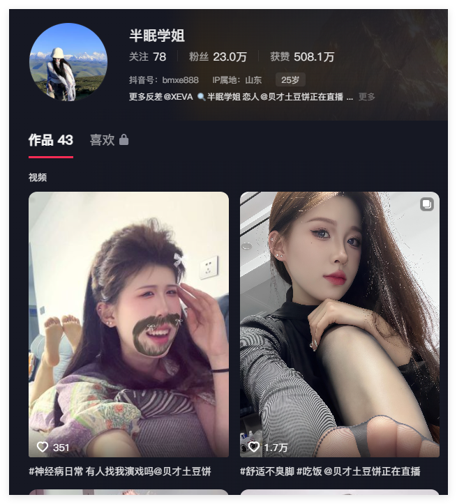 拥有23万粉丝的抖音长腿御姐半眠学姐,作为一位顶级高颜值的网红,她的身材令人赞叹,曲线优美、线条流畅,一双修长的美腿更是不知道迷倒了多少老司机。近期还流出了她的大尺度私拍福利视频,备受关注。