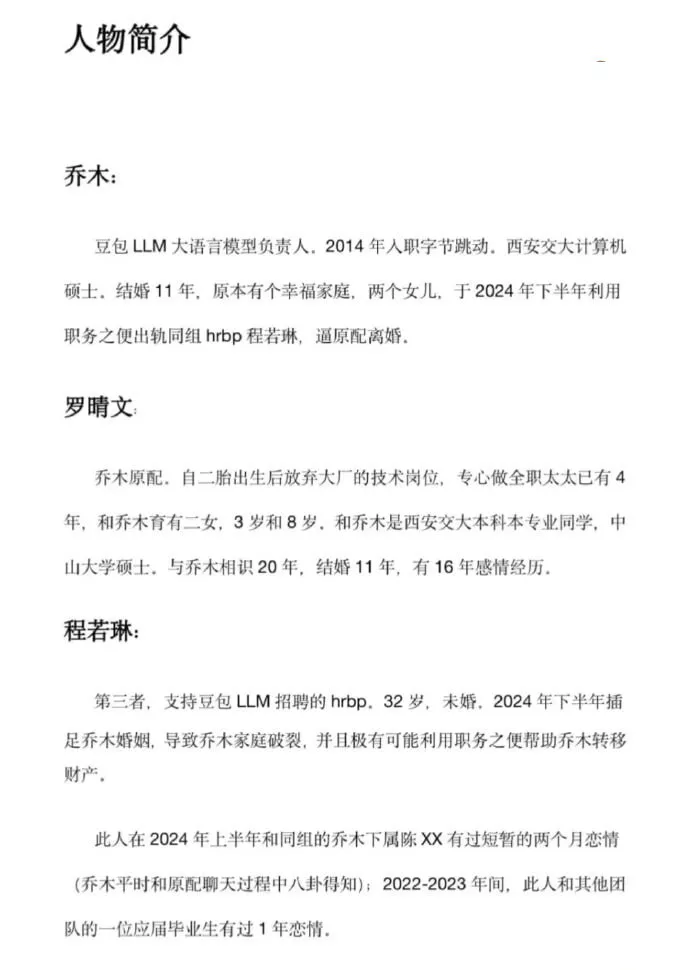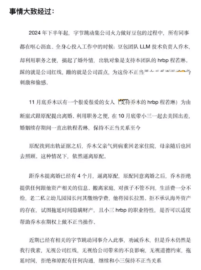 字节跳动近期曝出一起涉足婚外情的惊人新闻。事件的主角是字节跳动旗下豆包语言模型项目的负责人乔木。他的妻子控诉他在婚姻期间出轨,并提供了详细证据揭露了他的外遇对象是一名女同事,事件的细节令人震惊。
