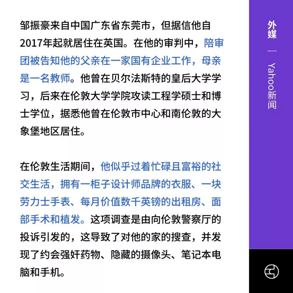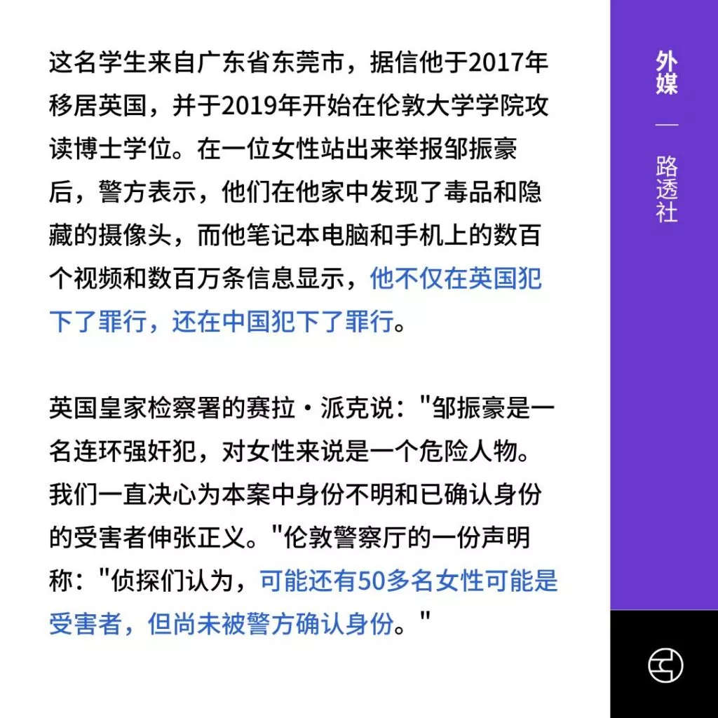 东莞的一名富二代留学生,博士生邹振豪,近日被指控对多名女性实施威胁。多达23位女性提供了证据,控诉这位嫌疑人利用药物使她们失去意识,从而任意Cao控她们。目前此人已经被英国警方逮捕进一步调查,在现场发现大量违禁药品以及偷拍设备。