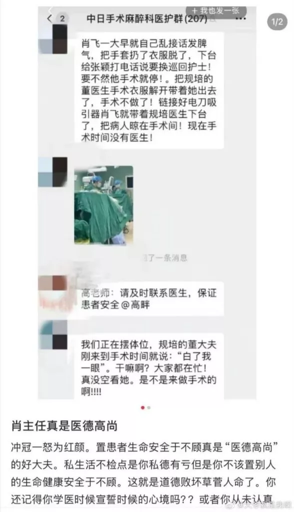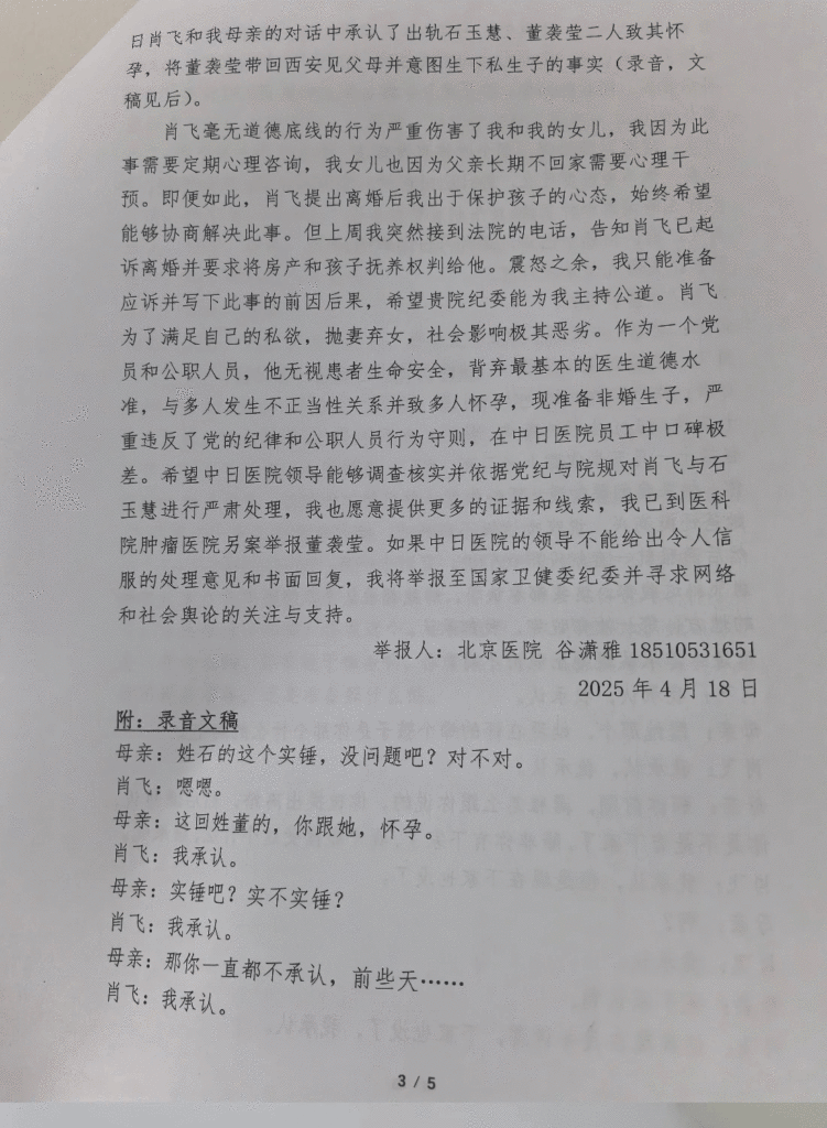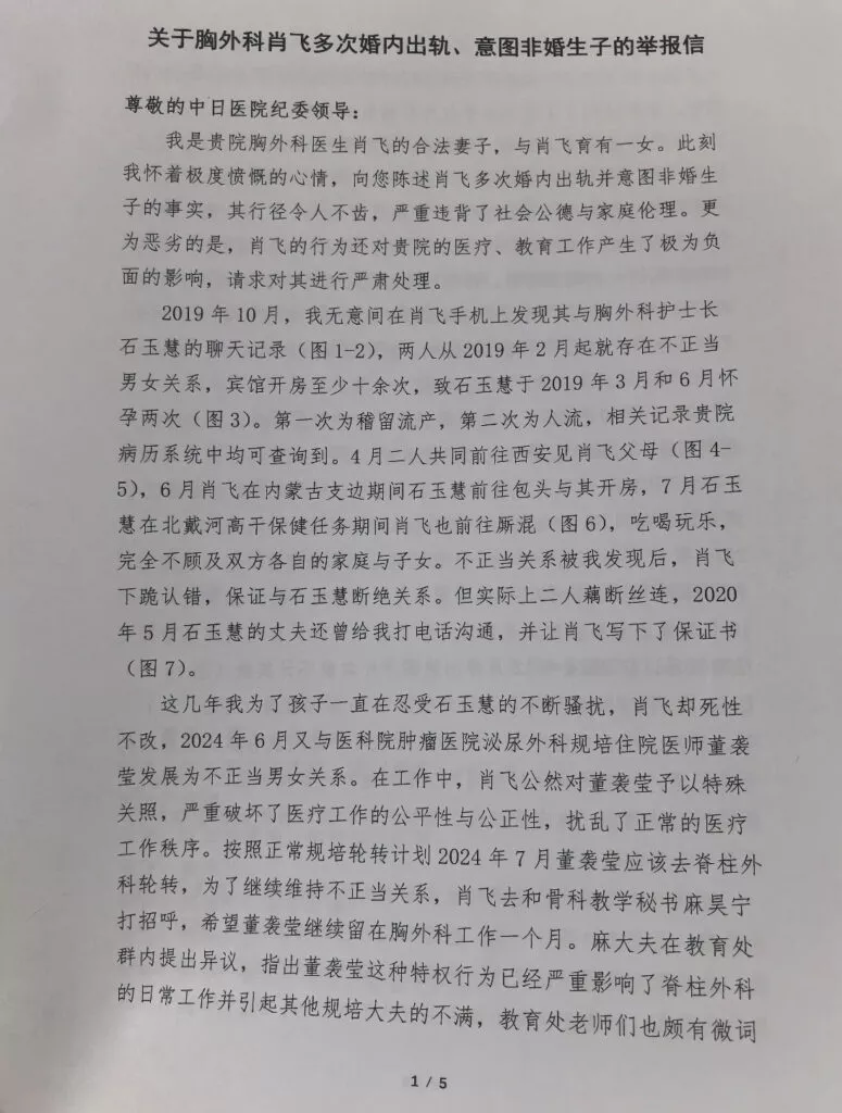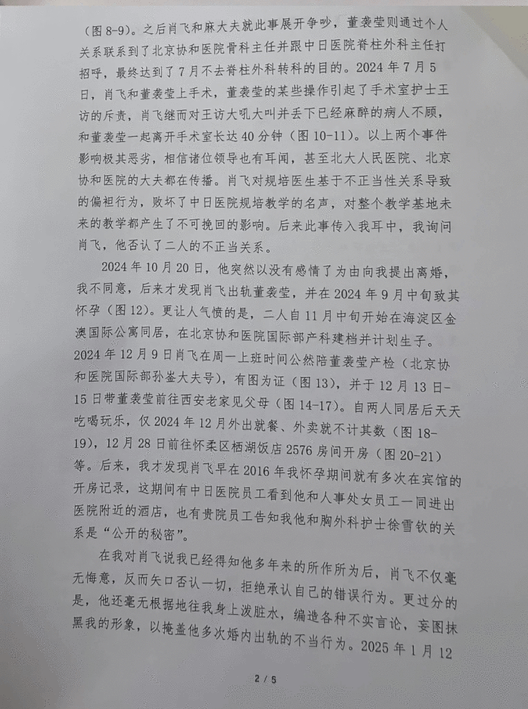 中日友好医院匈外科副主任医师肖飞因多次婚内出轨而遭妻子实名举报,涉及的女性至少有四名。除此之外,妻子还指控他在手术过程中曾突然离开,致使病人独自留在手术台上,令人震惊。