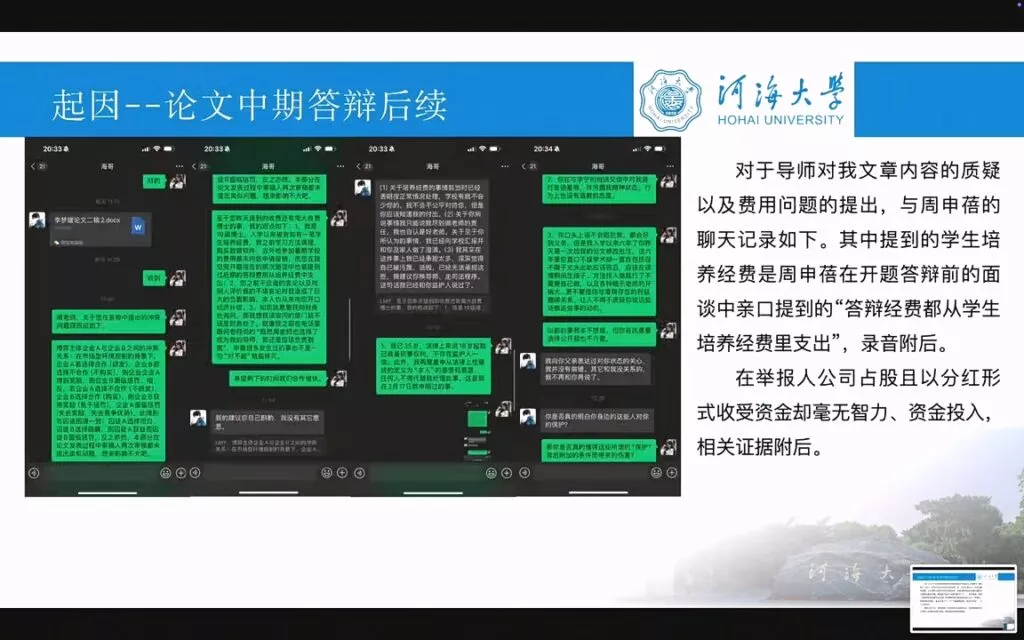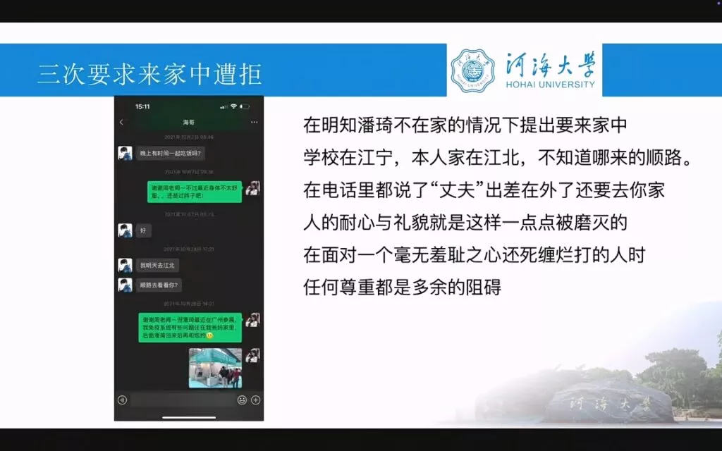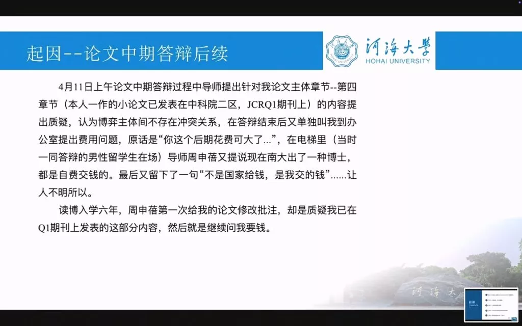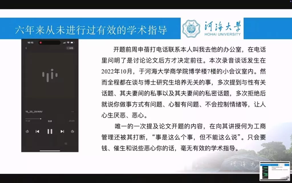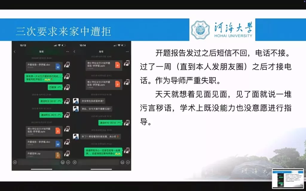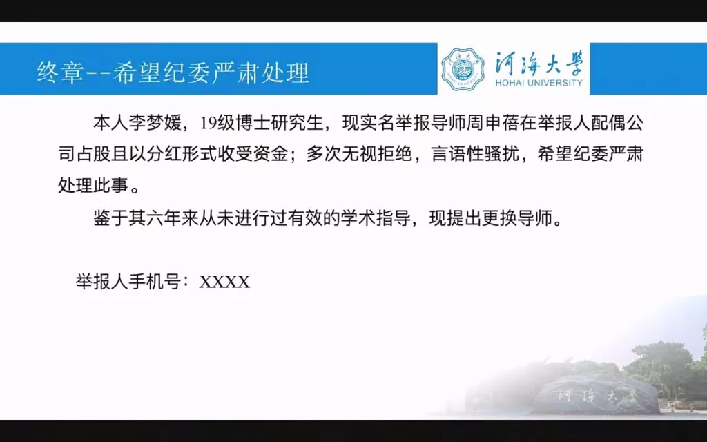 河海大学引发关注,女博士李梦媛揭露导师周申蓓的不当行为。李梦媛举报指出周申蓓与她配偶有不当关系,知晓李梦媛已婚却多次言语搔扰她。周申蓓还试图趁她丈夫不在时上门提供“学术指导”,遭拒后态度恶劣。
