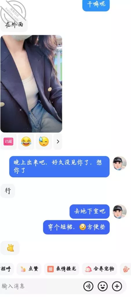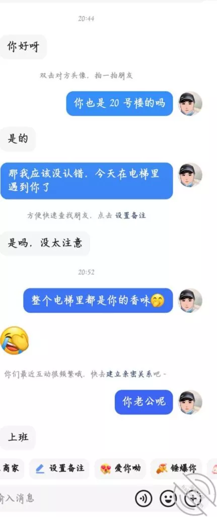 自从下午在电梯里遇到楼下小少妇后,脑子都是她性感的身材,那迷人的香味直冲灵魂,真想把她压在身下狠狠的蹂躏她,到家后从业主群找到了她(我们的业主群都要备注几栋几单元几号),可惜她设置了权限加不了她,好巧不巧天无绝人之路在快👋同城刷到了她,赶紧给她打个招呼,等到晚上她才回信息,因为要哄孩子也没聊几句,兄弟们评论区给点意见怎么拿下她