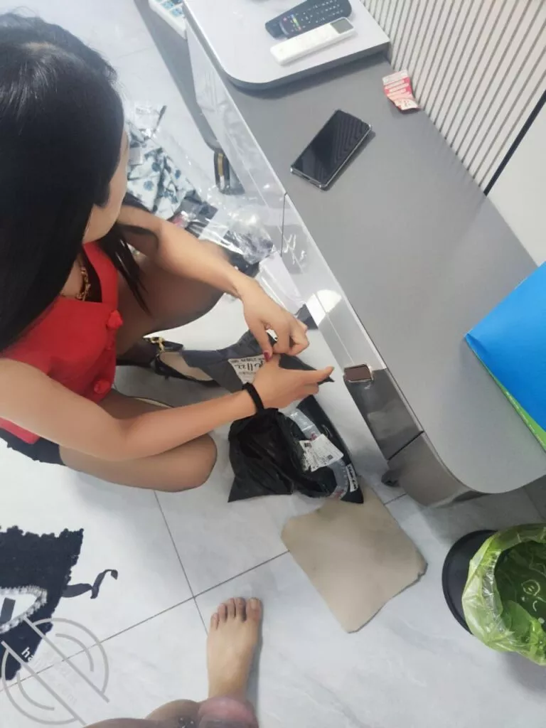 书接上回,给嫂子从网上买了很多情趣制服,什么办公室啊、空姐啊,某蛋糕店之类的制服,嫂子在我JB底下拆快递呢
