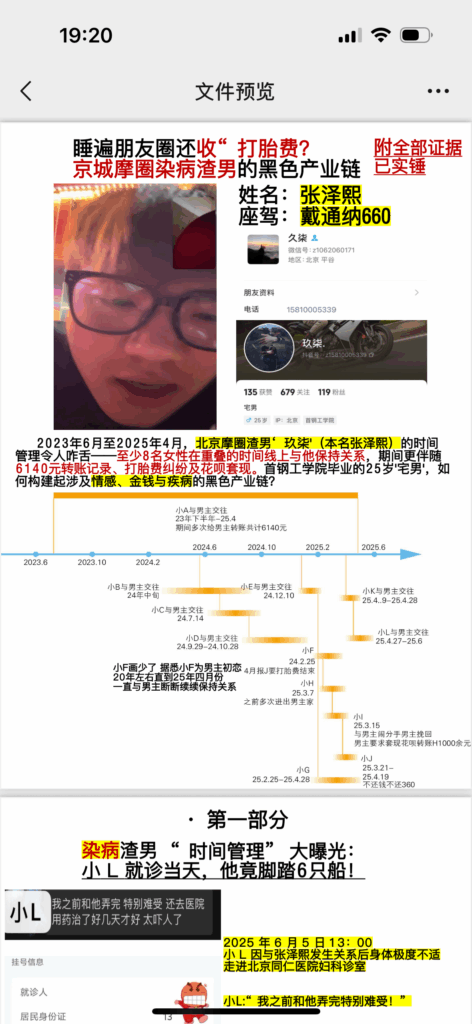 16长文ppt曝光北京摩托圈顶级时间管理大师渣男张泽熙,脚踏六只船的究极劈腿大师。京爷还是太全面了,找女友只是为了捞金,无缝衔接只是怕自己饿肚子,就算是打胎,还能在挣你一笔。