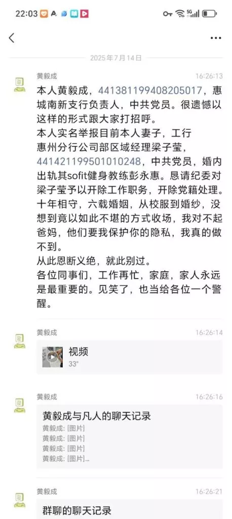 广东惠州工商银行梁子莹婚内出轨健身教练彭永惠被丈夫实名举报