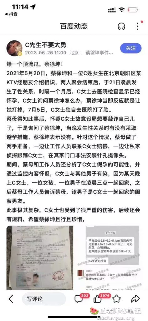 爆料蔡某坤2021年520的时候认识了c女士发生关系,之后C女士怀孕,蔡某坤要求打胎。“都说炒粉不能放鸡精你看出事了吧”。