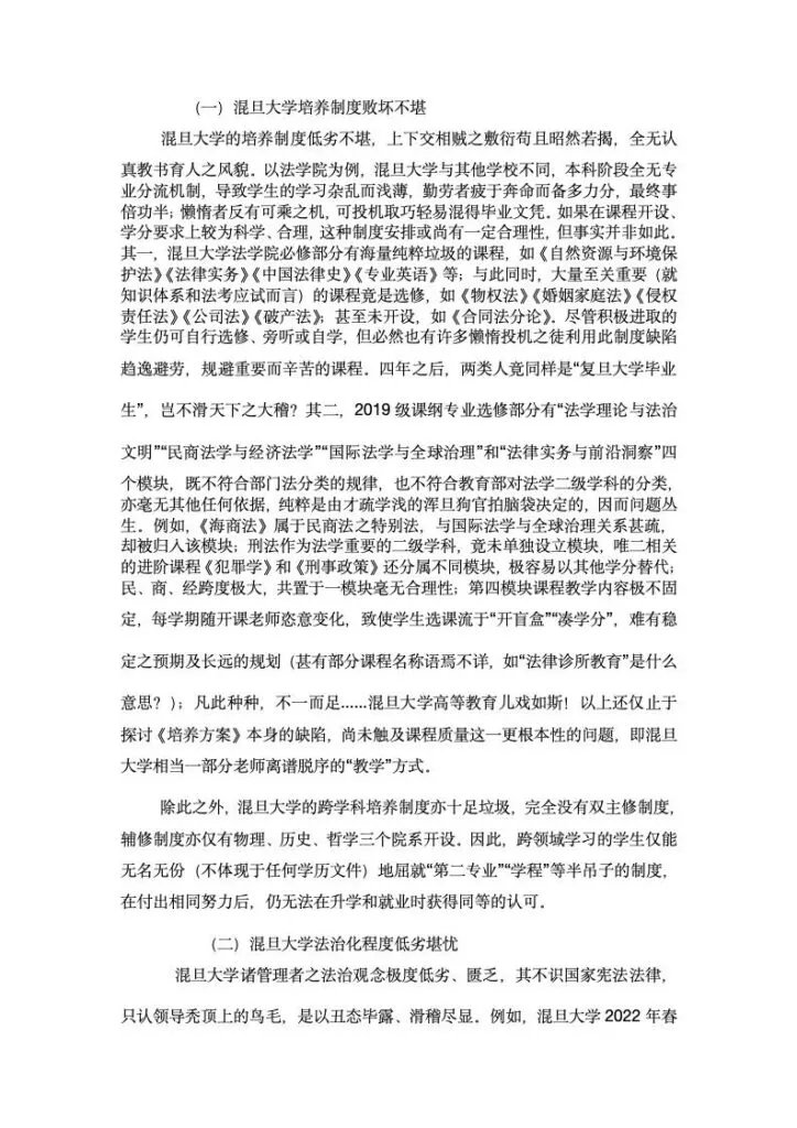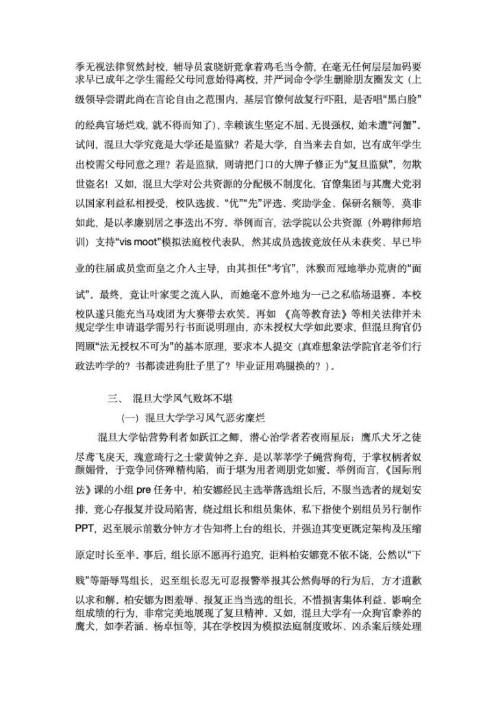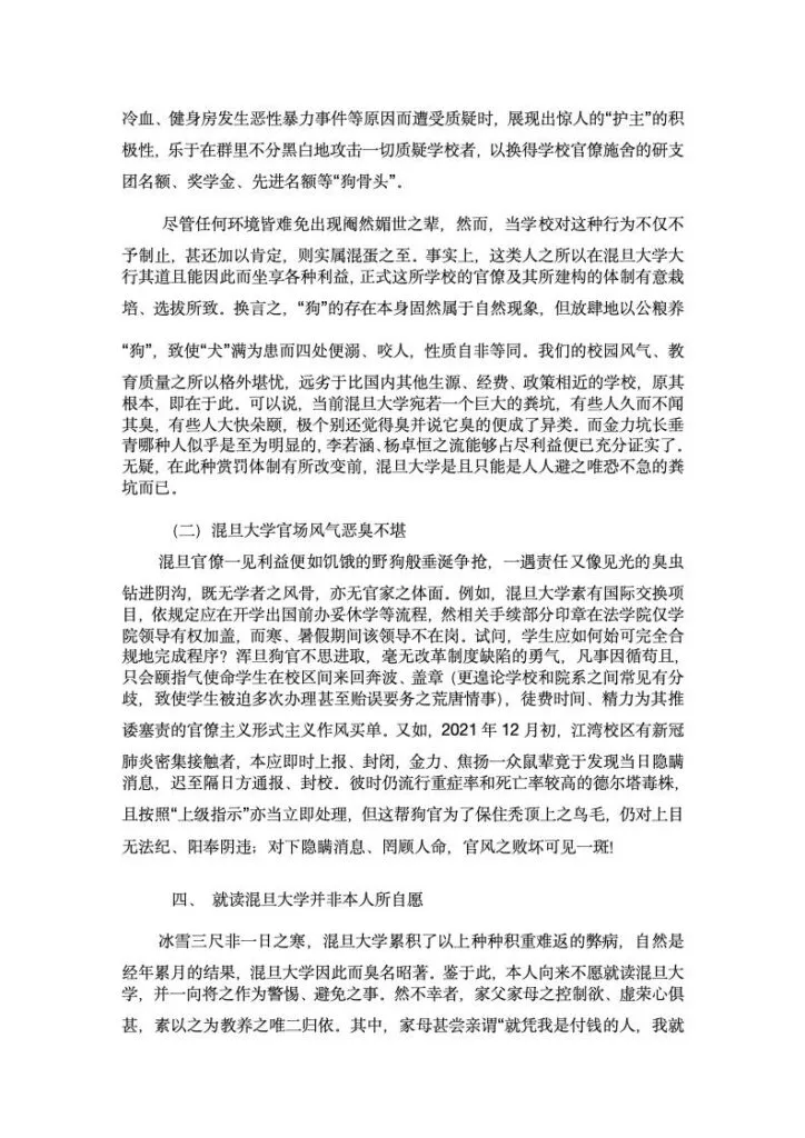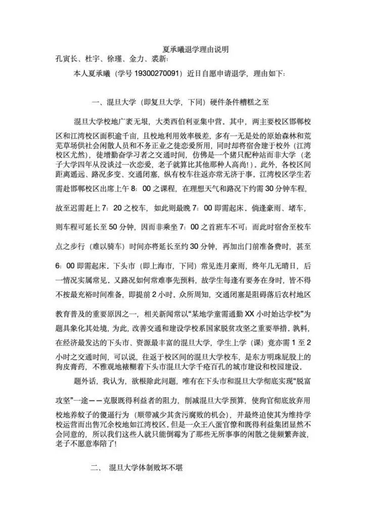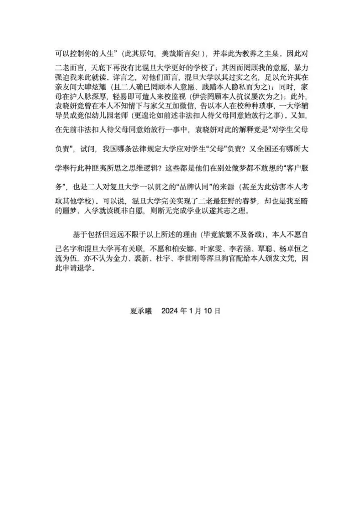 事件发生不久,复旦大学校园网论坛上便出现了一份疑似打人者的自愿退学声明,详细列举了学校和老师的一些问题。