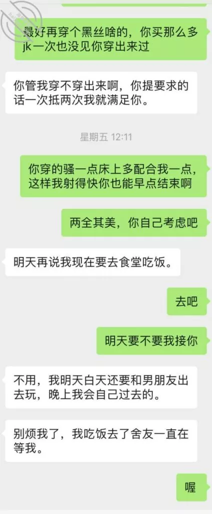 上次楼道Cao完堂妹之后我安分了两天,后面又约了堂妹两次她都说没空要陪男朋友,海友们总说我对堂妹过分,要让我对她好一点才能彻底把她拿下,实话说堂妹和她男朋友是高一就认识了,五年多的感情好不好不知道,反正听说两人大学毕业了就打算结婚的,而且我都打算等妹妹实习完一起去别的城市了,所以也没有想把堂妹彻底拿下,这事也不敢让妹妹知道了,别到时候鸡飞蛋打两个都留不住,而且现在堂妹对我比较反感,我就抱着爽一次算一次的想法把堂妹当个玩物好了,两次约不出来堂妹我又想威胁她了,堂妹就是吃硬不吃软的主,但是第三次约堂妹发现威胁也不好使了,堂妹态度变强硬了说我再拿照片威胁她就鱼死网破,到时候不仅要告诉家里人还要报警,感受到堂妹态度的转变我也没敢细想其中的缘由,赶紧换了一副嘴脸和堂妹好生商量,看堂妹铁了心要和我了断的意思,我就提出来最后陪我十次的条件,堂妹没立马回复我说在外面陪男朋友逛街等晚上再说,到晚上堂妹大概是回宿舍了,给我发了一条最多五次不然一次都别想要,这坚决的态度让我都没办法拒绝,