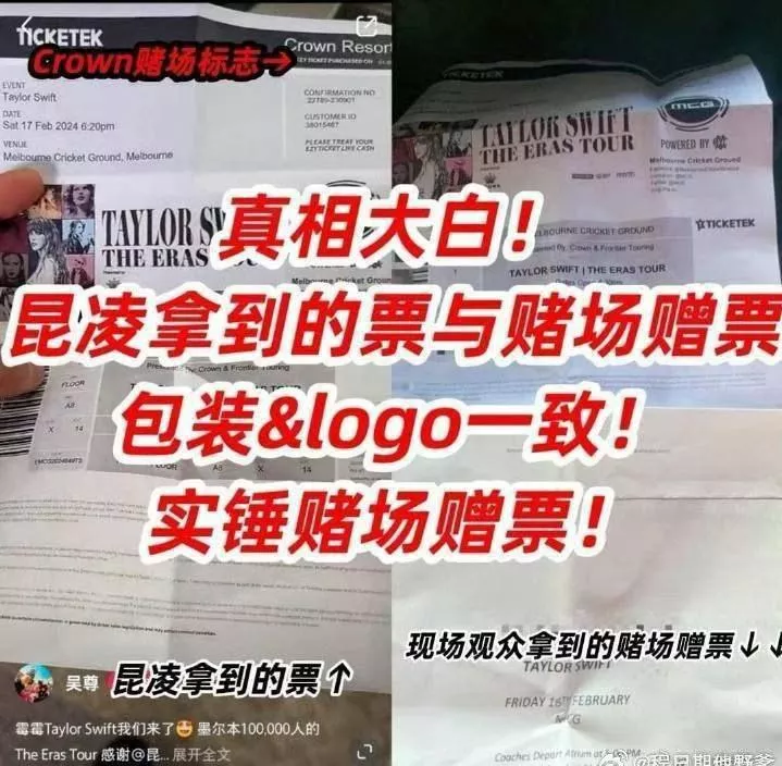 网友对比自己妻子拿到的澳门赌场赠与的霉霉演唱会门票与昆凌门票的对比。不过一张赠品就石锤还是太简单了,毕竟大部分高消费场所,附赠些小礼品都是基Cao