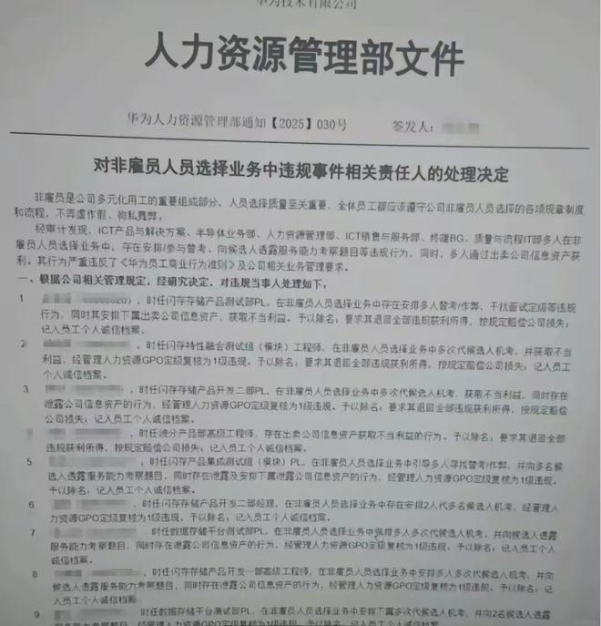 2023年3月11日,华为内部一份文件被曝光。该文件是人力资源部发布的《对非雇员人员选择业务中违规事件相关责任人的处理决定》。文件中指出,在招聘非雇员的过程中,多名产品线负责人存在多项违规行为,包括参与替考、安排他人代考以及向应聘者泄露考试题目等。这些行为的严重性引发了广泛的社会关注。