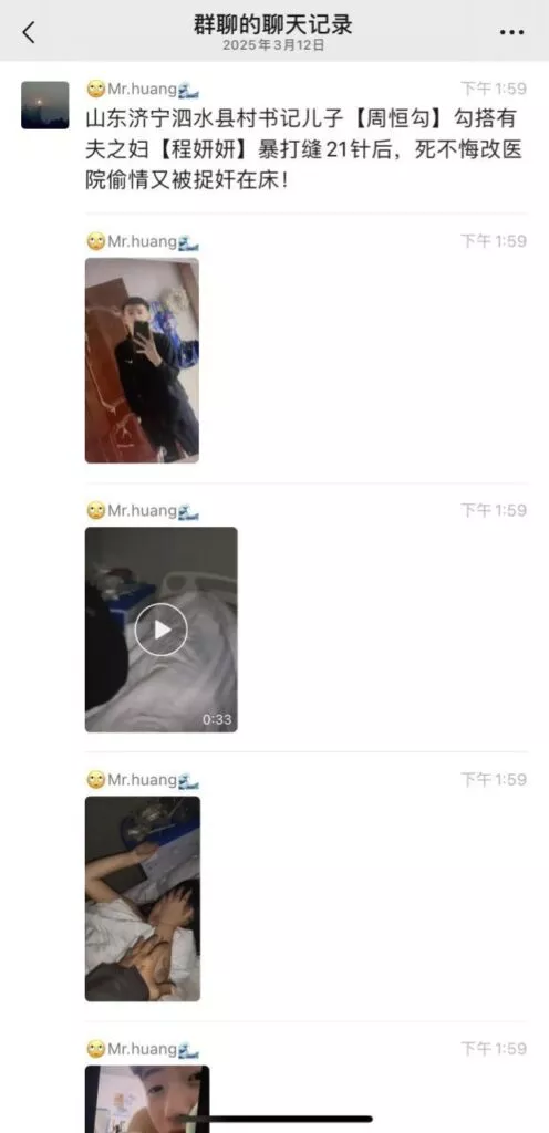 山东济宁某村的村书记之子周恒,因吸引已婚女子程妍妍,被其未婚夫痛打致伤,送医缝合了21针。然而,这并未让周恒有所收敛。在前往医院的途中,程妍妍的未婚夫意外发现他们两人在医院内再次私会,竟然在病房内不知悔改,再次被捉了个正着!