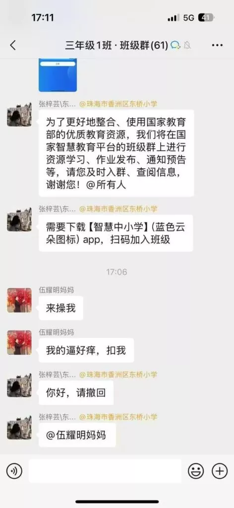 只能说这种乌龙事件已经不是一次两次了,而是三番四次五六次,每一次的发生都是一场伦理大剧的开端。珠海市东桥小学的班级微信群,伍耀明的妈妈错把露骨不雅搔话发到了班级群,闹出了大乌龙事件
